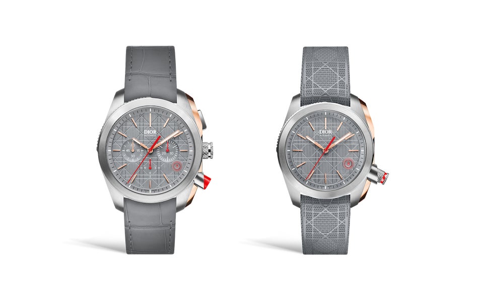2024年10月、同コレクションに数量限定の2モデルが加わります。クチュールの美学を宿し、デザインに再解釈された新モデルでは、ダイアルや針など至るところにピンクゴールドがあしらわれ、マスキュリンとフェミニンのコントラストが際立つ、洗練性に溢れたデザインで登場します。全体にはディオールのヘリテージであり、シグネチャーでもあるグレーを纏い、「シフル ルージュ」のシンボルであるレッドをポイントに添えます。38mmの自動巻きモデルにはグレーのマクロカナージュラバーストラップを、41mmの自動巻きクロノグラフモデルにはグレーのアリゲーターストラップを配し、いずれもインターチェンジャブル仕様にて自由に付け替えをお楽しみいただけます。