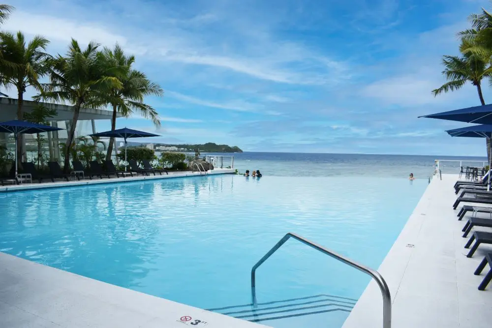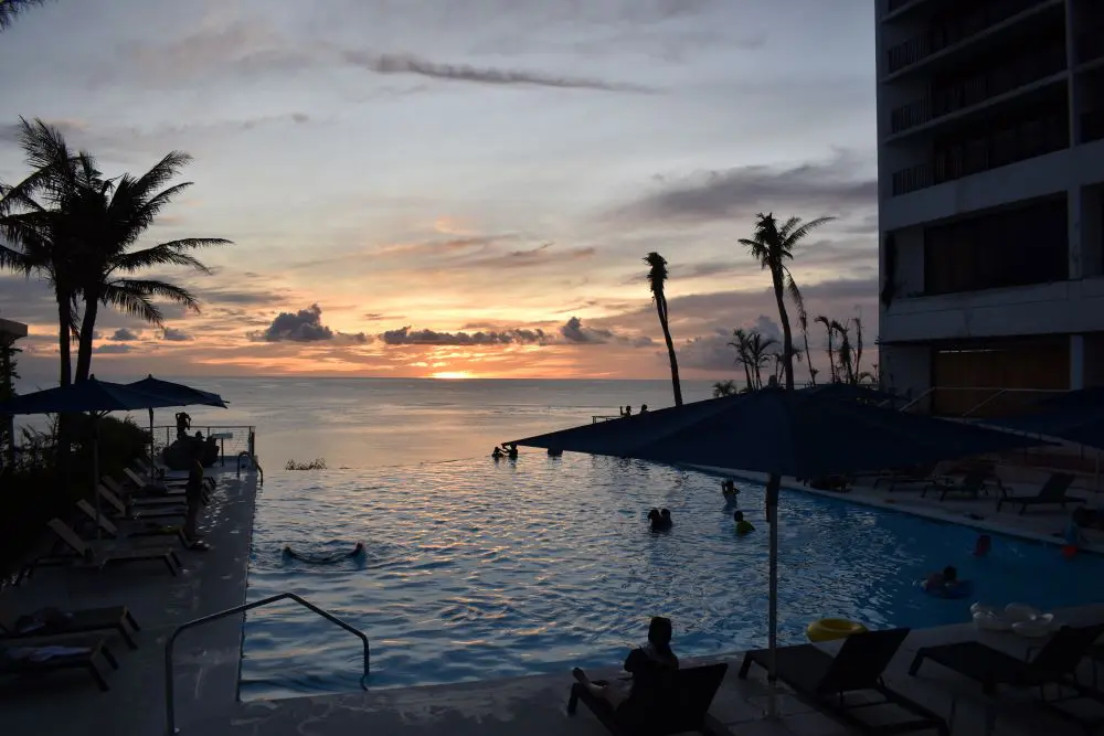 グアムリーフホテルには、タモン湾に面したインフィニティプールがあります。無限に海につながっているように見えるインフィニティプールは非常に美しく、宿泊者限定で利用できます。特に、プールから見える夕日は絶景で、必ず見てほしい景色の1つです。