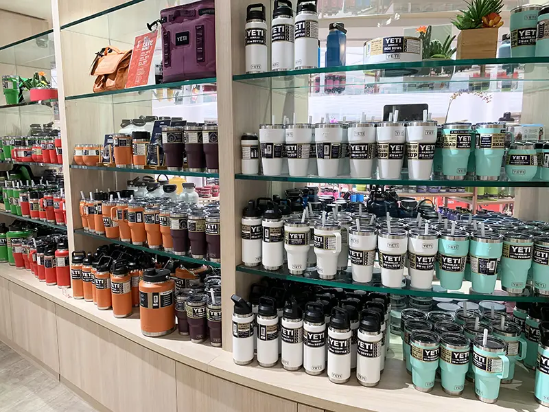 ▲人気マイボトルブランド「イエティ」も豊富に取り揃えられている