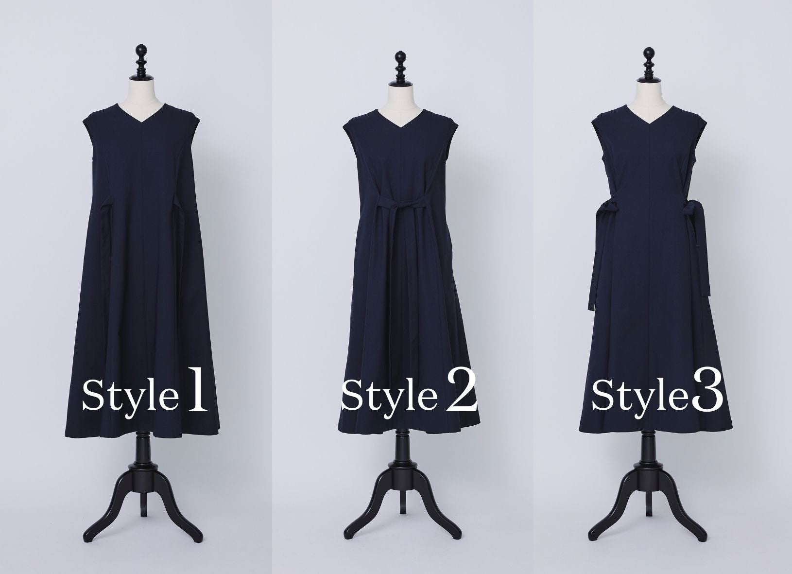 また、サイドにあるリボンの結び方を変えることで異なる雰囲気を楽しめます。ウエスト周りの調整ができることで、移動時は締め付けず快適に過ごせるなど、移動が多いCAとアナウンサーならではのアイデアが詰まった一着です。