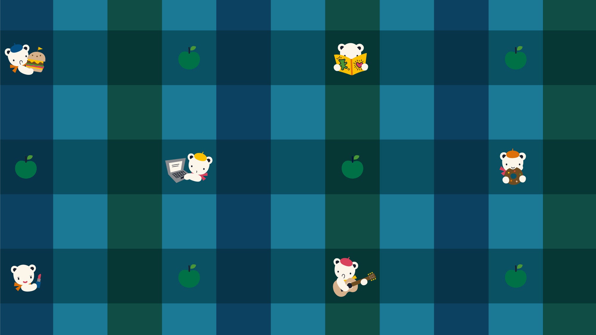 青系ファミリアチェックに、日常の様々なシーンを楽しむクマちゃんを描いたオリジナル総柄プリントが誕生。