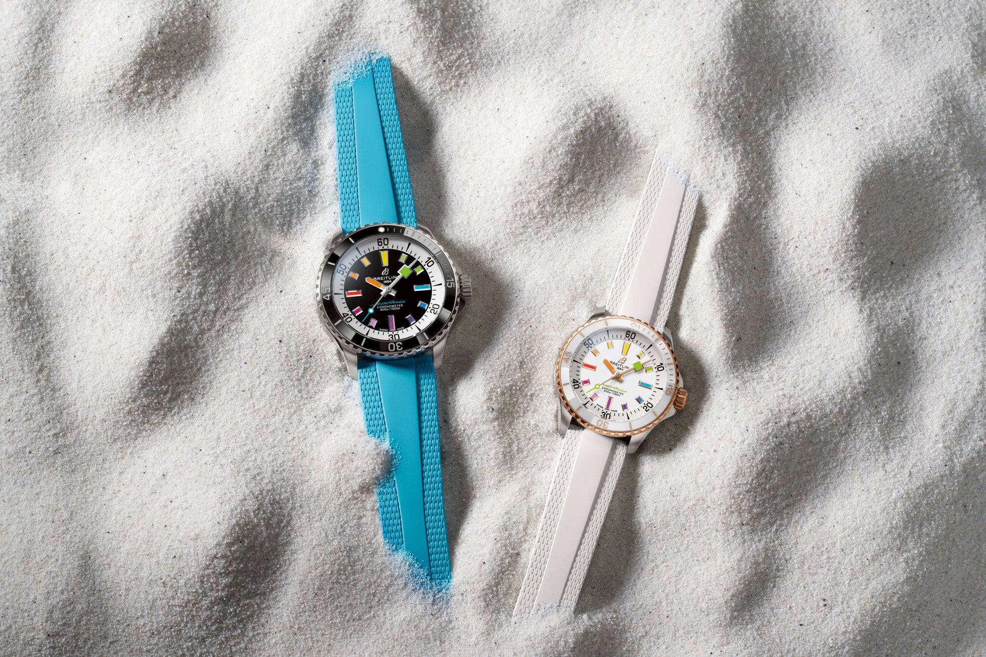 ブライトリングCEOであるジョージ・カーンは、これら新モデルの本質を次のように捉えています。「夏が訪れるとともに、カラフルなスーパーオーシャンの新作は、波乗りの際はもちろんのこと、ビーチサイドのディナーでくつろぐ時にも究極のパートナーとなることでしょう。」