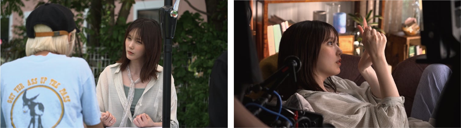 ソファで寝転ぶシーンでは本当の自分の部屋のようにリラックス。カメラが回っていない時にも嬉しそうな様子で出来上がったネイルを見つめていました。セッティング中のカメラに向けて少しおどけた風に手元を見せて現場を和ませる場面もあり、スタッフからは「ああ、このカットも使いたい!」と声が上がっていました。撮影中、監督から「違う表情をいくつか取りたい」と指示があった時には笑顔で応え、わずかな表情の違いを見事に表現。監督からOKの声がかかると安堵の表情を浮かべていました。
