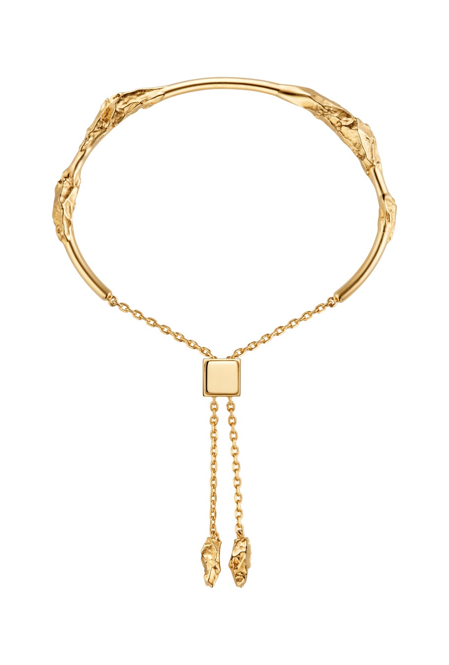 細く繊細なチェーンに、職人技の光る岩石の質感を感じさせる洗練されたチャームをあしらったペンダント。有機的で丸くくり抜かれたフォルムからは素肌が垣間見えます。2つのリングによる着用時の長さが調整可能。