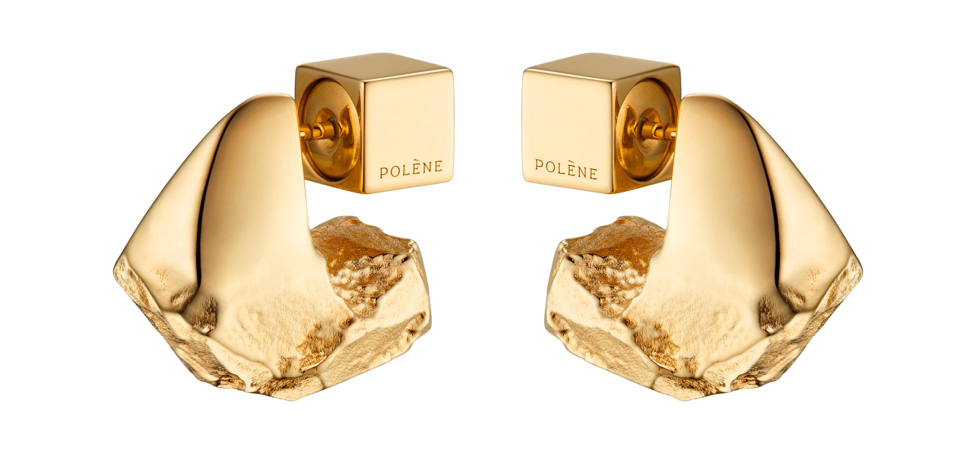 鉱物の塊をモチーフとしたフォルムの、力強く存在感のあるミニピアス。なめらかな磨かれた表面から岩肌のような質感への変化を楽しめる。