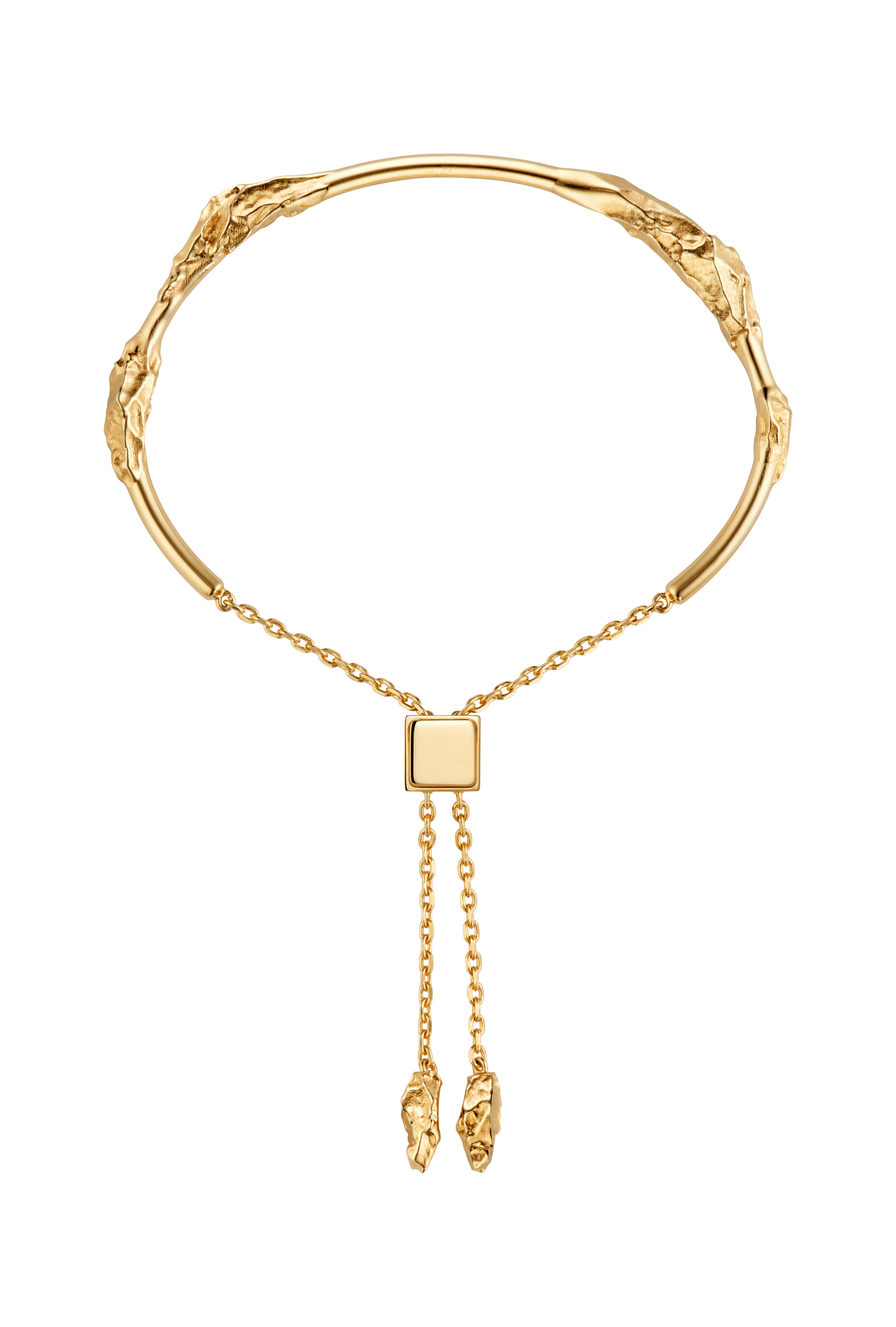 手首を繊細に飾る、ジョンクブレスレットの優美さとエレガンス。流れるようなラインに散りばめられた、まるで地面から現れた岩石のようなデザインが特徴的。