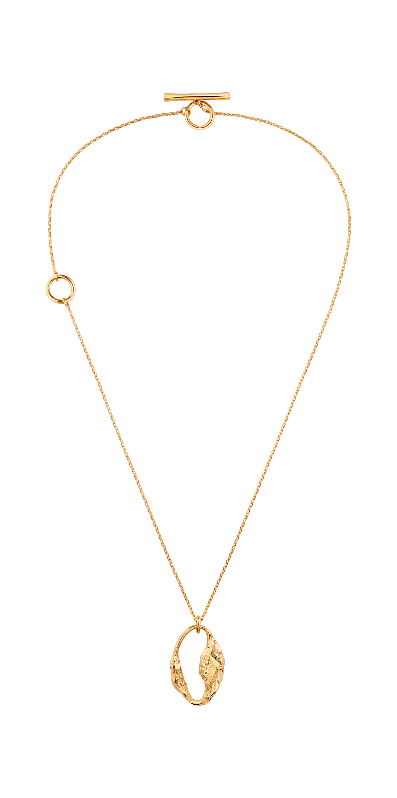 細く繊細なチェーンに、職人技の光る岩石の質感を感じさせる洗練されたチャームをあしらったペンダント。有機的で丸くくり抜かれたフォルムからは素肌が垣間見えます。2つのリングによる着用時の長さが調整可能。