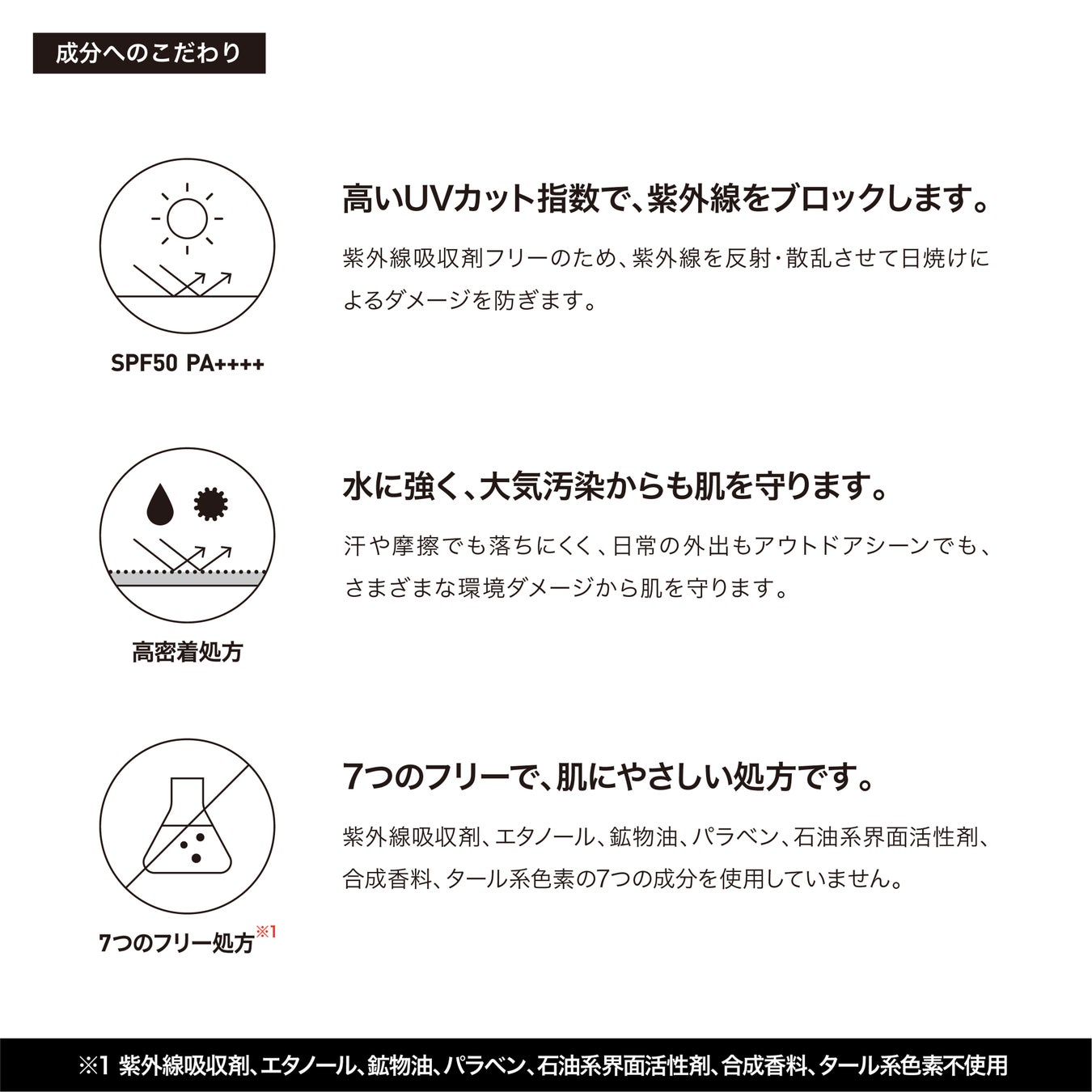 ●紫外線吸収剤、エタノール、パラベン、鉱物油、石油系界面活性剤、合成香料、タール系色素の7つの成分を使用せず、肌にやさしい処方。