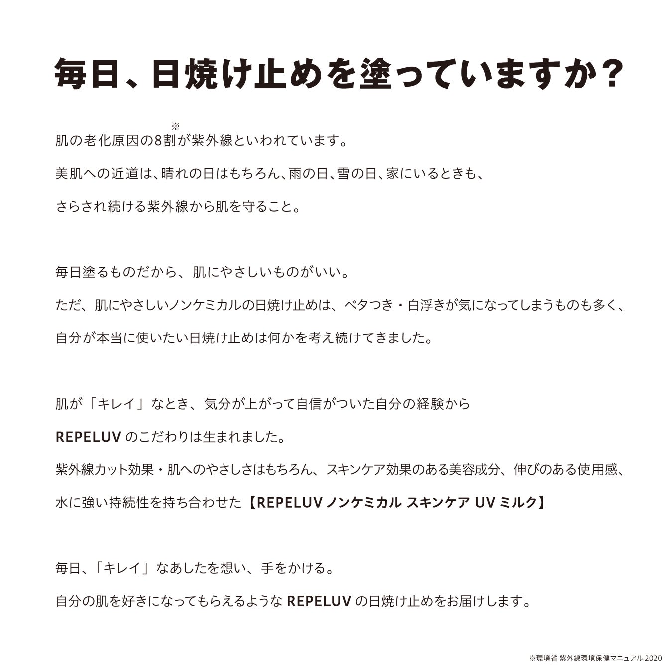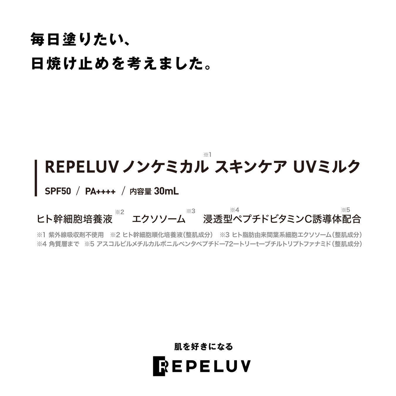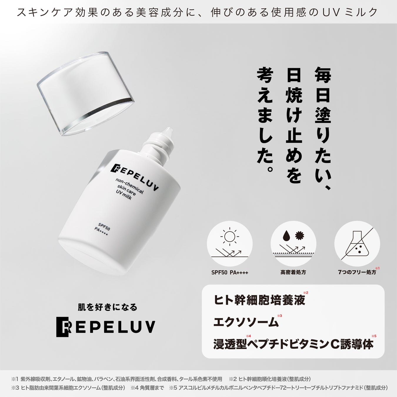 株式会社face the cosmos (読み:フェイスザコスモス、本社:東京都港区、代表取締役:本嶋瑠菜)が運営するUVケア特化スキンケアコスメブランド「REPELUV(リペルブ)」(以下、REPELUV)は、ヒト幹細胞培養液を配合したノンケミカルの日焼け止め「REPELUV non-chemical skin care UV milk(リペルブ ノンケミカル スキンケア UVミルク)」を2024年6月22日よりREPELUV ONLINE SHOP(https://www.repeluv.com/) にて販売を開始しました。