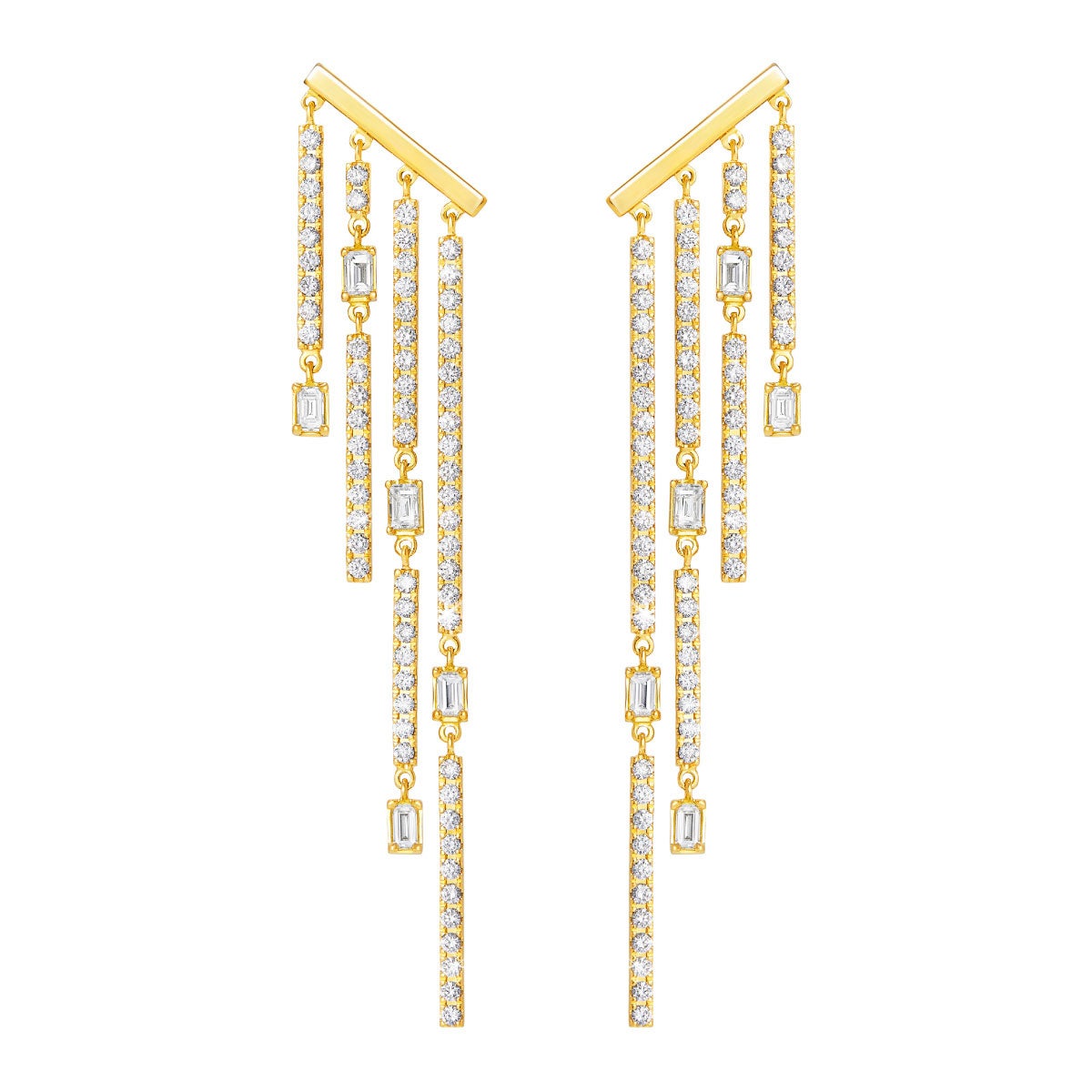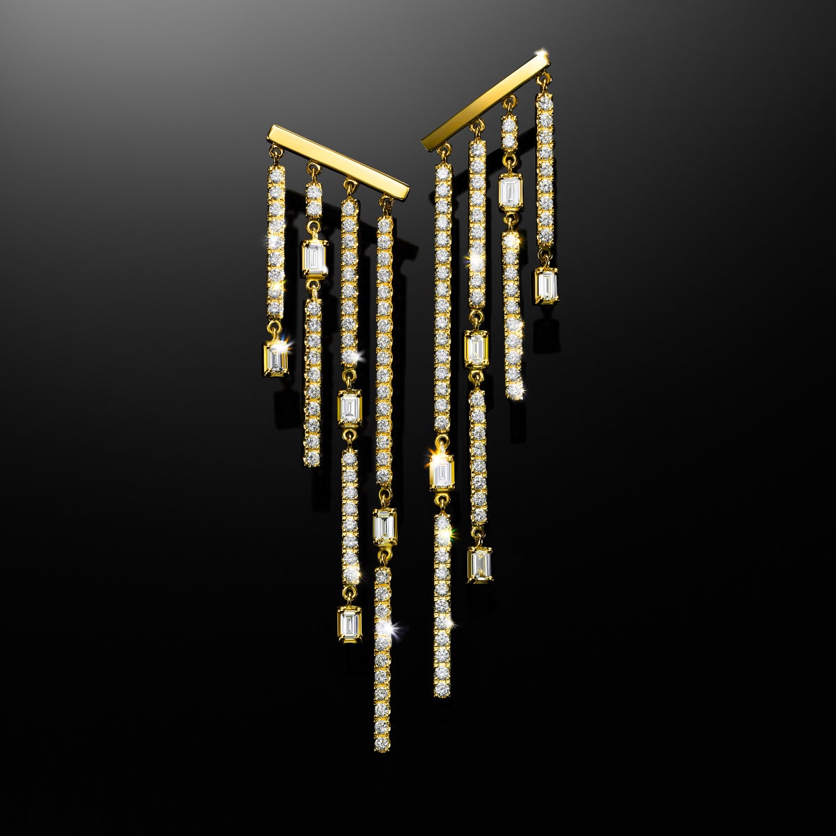 バゲットカットダイヤモンドとラウンドブリリアントカットダイヤモンドがまるで丁寧に織り上げられたシルクのように軽やかに優雅に煌めき、上品な輝きの余韻をもたらす「シャンデリア スウェイ」。ダイヤモンドのスレッドがしなやかに揺れるたびに凛とした表情を紡ぎ出し、スタイリングにモダンなエレガンスを添えます。