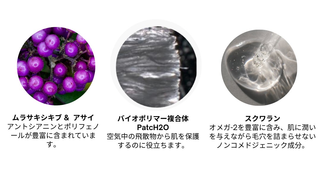 特許取得成分である「PatcH2O®」はマイクロネットワークが「第二の皮膚」膜を形成し、水分を肌に閉じ込め、「目には見えないパッチの網目」を作り出し、大気中の飛散物の攻撃から肌を守ります。