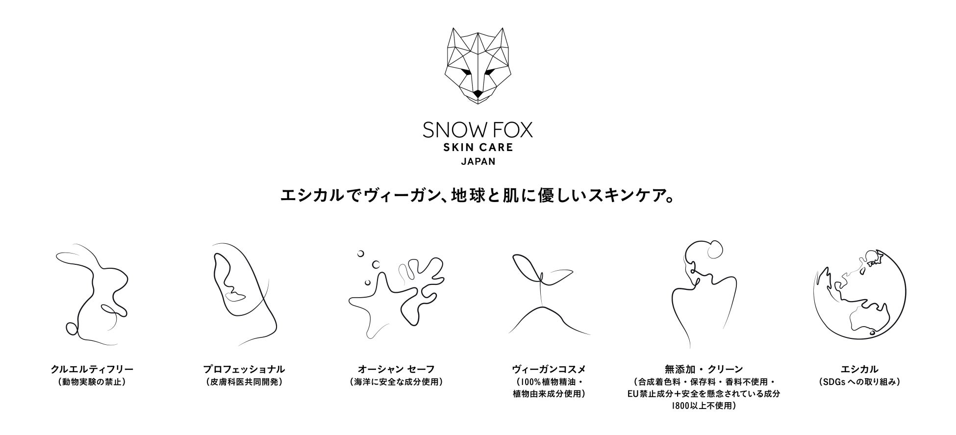 SNOW FOX SKINCAREは敏感肌向けに皮膚科医と共同開発し、無添加にこだわり開発された、植物学と皮膚科学を融合したハイブリッド型スキンケアです。地球第一主義を理念に、ヴィーガン・エシカル・クルエルティフリー・クリーン・プロフェッショナル・オーシャンセーフの6つの哲学を商品開発理念に掲げています。