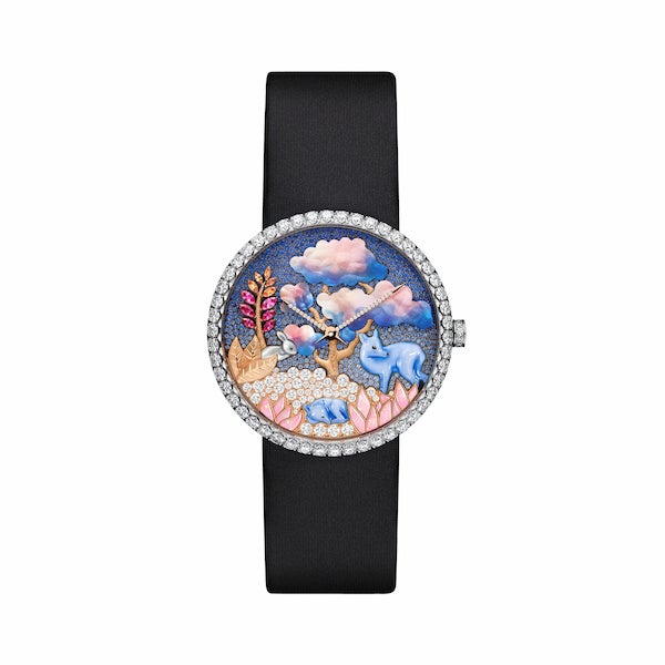 ファインジュエリーのクリエイティブ ディレクターであるヴィクトワール・ドゥ・カステラーヌは、タイムピースをジオラマに見立て、ボリューム感と色彩が織り成すミニチュアの景観を芸術的に再現しました。ディオールを象徴する「トワル ドゥ ジュイ」モチーフに着想を得たクリエイションは、まるで絵画のようなマスターピースに昇華しています。