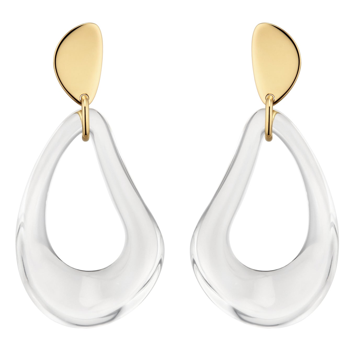 ピアスは、ゴールドと彫刻されたガラスの、2つのしずくをつるしています。
