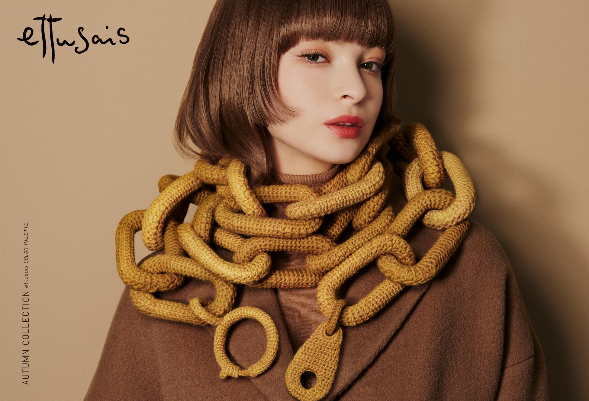 異素材なニットモチーフで顔を縁取ることで、肌のツヤや透明感をより際立てています。