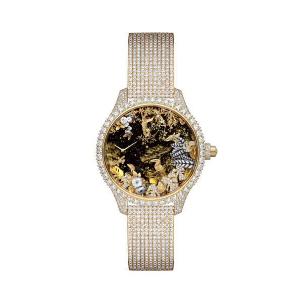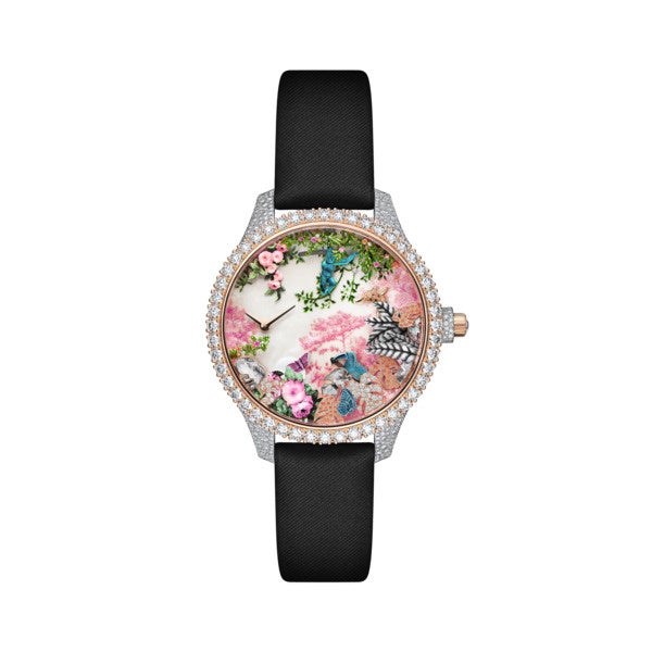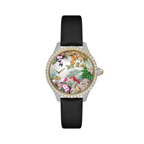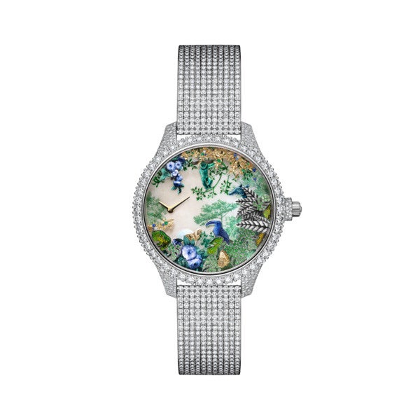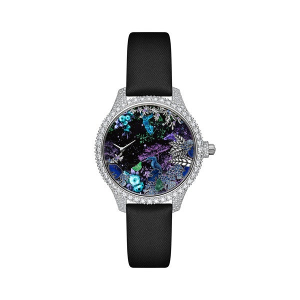 同コレクションの中でもムッシュ ディオールが愛した動植物をデザインテーマに表現した「ディオール グラン ソワール オートマタ ジャルダン レヴェ」タイムピーシズは、私たちを夢の庭園へと誘います。