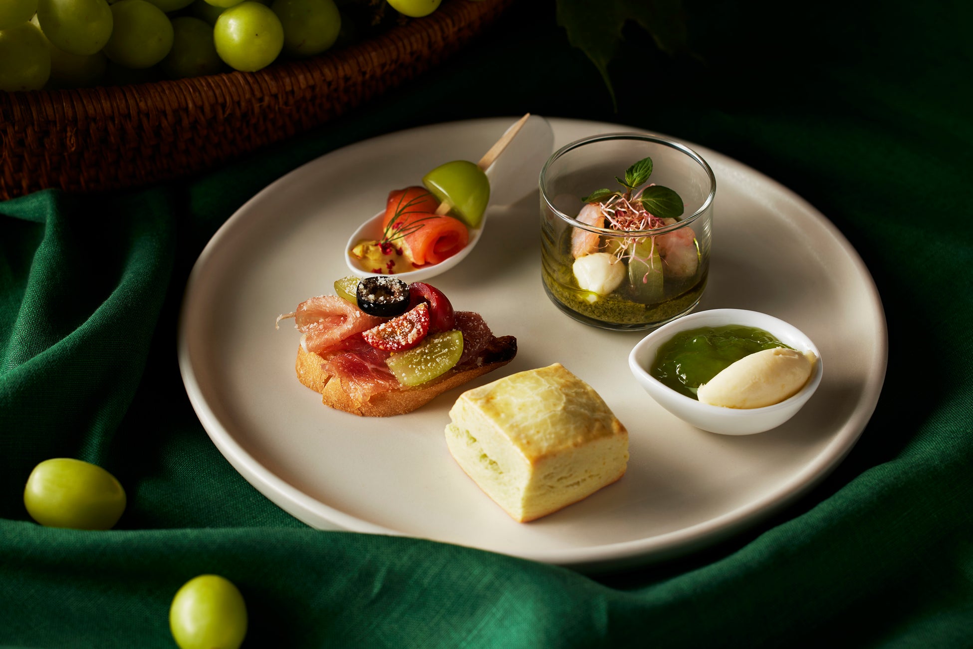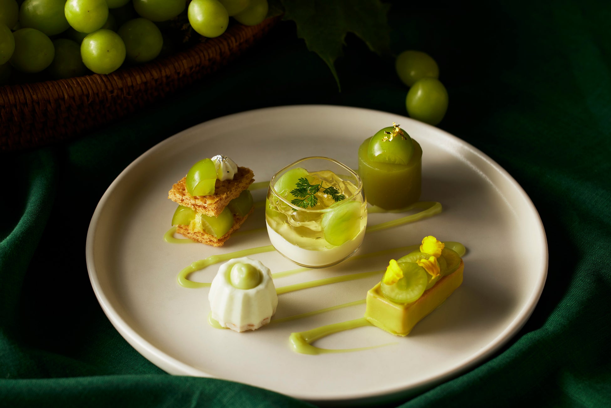 上段の「ホワイトチョコレートとココナツのムース ライムのメレンゲ」は、シュトロイゼルの生地にホワイトチョコレートとココナツのムースを乗せました。仕上げにさっぱりとしたライム風味のメレンゲと、シャインマスカットをトップとプレートにも贅沢に飾り付け、ザクザクの生地、滑らかなムース、果実のシャキっとした三種の食感のハーモニーが絶品の一皿です。中段には、杏仁のパンナコッタとマスカットのゼリーを順に流し込み、シャインマスカットの果実を入れたグラスデザートや、白餡を使用した「マスカットの羊羹」といった和テイストな一品など、甘くて爽やかな果実を多様にアレンジしたラインアップをご用意。下段のセイボリーにもシャインマスカットをたっぷりと使用しました。カクテルのように仕上げた「シャインマスカットと海老 モッツァレラチーズのカクテル」や、トーストしたバケットとのハーモニーを楽しむ「シャインマスカットと生ハム チェリートマトのタルティーヌ」など、シェフの腕が光る本格派のセイボリーをお楽しみください。