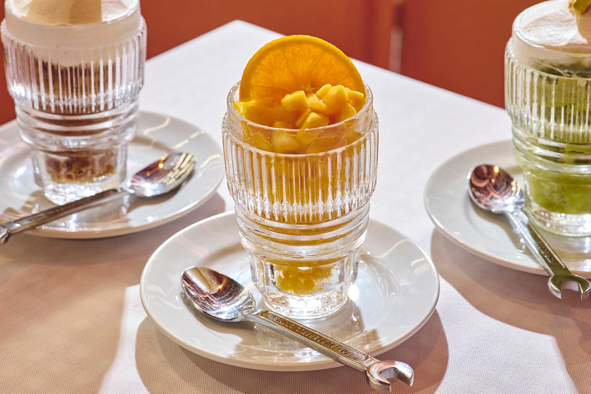 マンゴーとオレンジの甘味と酸味を生かした夏らしく爽やかなグラニータ。細かい角切りマンゴーとフレッシュなオレンジのスライスを添えました。冷たくジューシーな氷の粒が暑さを吹き飛ばします。
