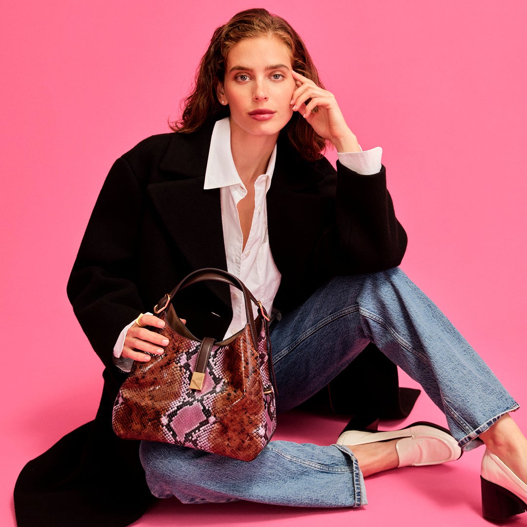 画像(下)左上から時計回りに mini flap chain crossbody ¥44,000, satchel H20×W32×D14cm ¥64,900, coin card case wristlet ¥22,000, medium crossbody tote H20×W26×D15 ¥560,500, deco satchel H20×W32×D14cm ¥64,900, chain shoulder ¥77,000, satchel ¥64,900, snake embossed leather medium crossbody tote ¥68,200 (すべて税込み価格)