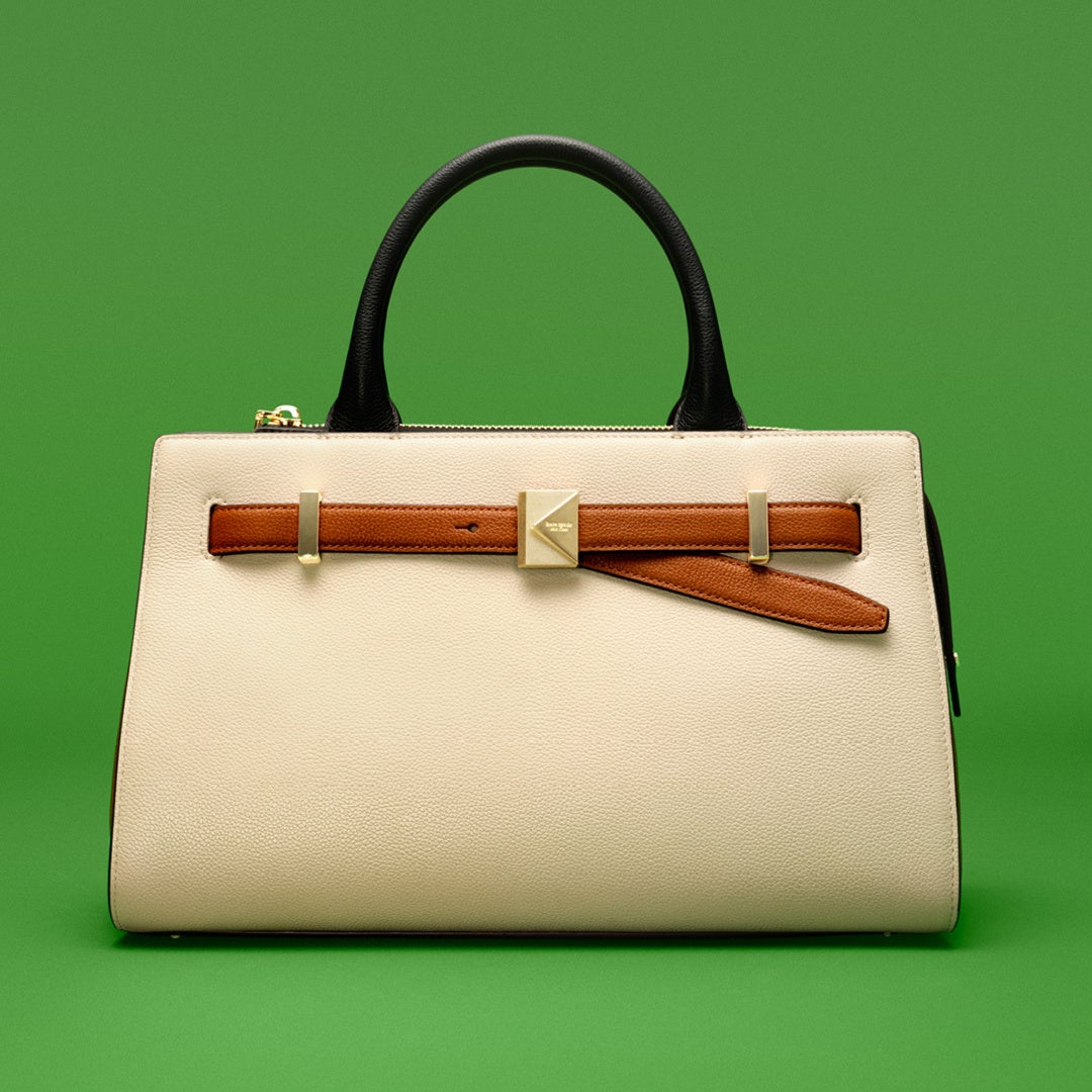 レディライクなフォルム、マイクロスエードのライニング、フロントのベルトバックルデザインのディテールがラグジュアリーな雰囲気を醸し出す、コンパクトなシルエットのサッチェルは、全てぺブルレザーを用い、タイムレストープ、ブラック、ミルクグラスに秋らしいチェリージュースを加えた全4色で展開されます。