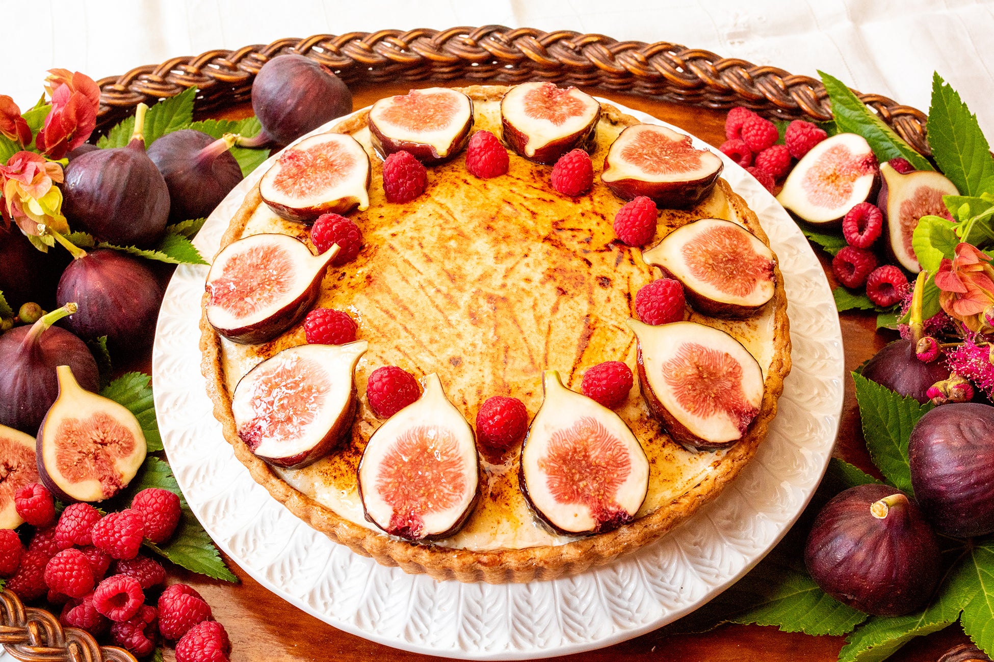 サワークリームを合わせたカスタードクリームとスポンジの層に、大きめにカットしたイチジクとクリームを飾りました。サクサクのパイに重ねたイチジクとラズベリージャムがアクセントの、ショートケーキをイメージしたタルトです。