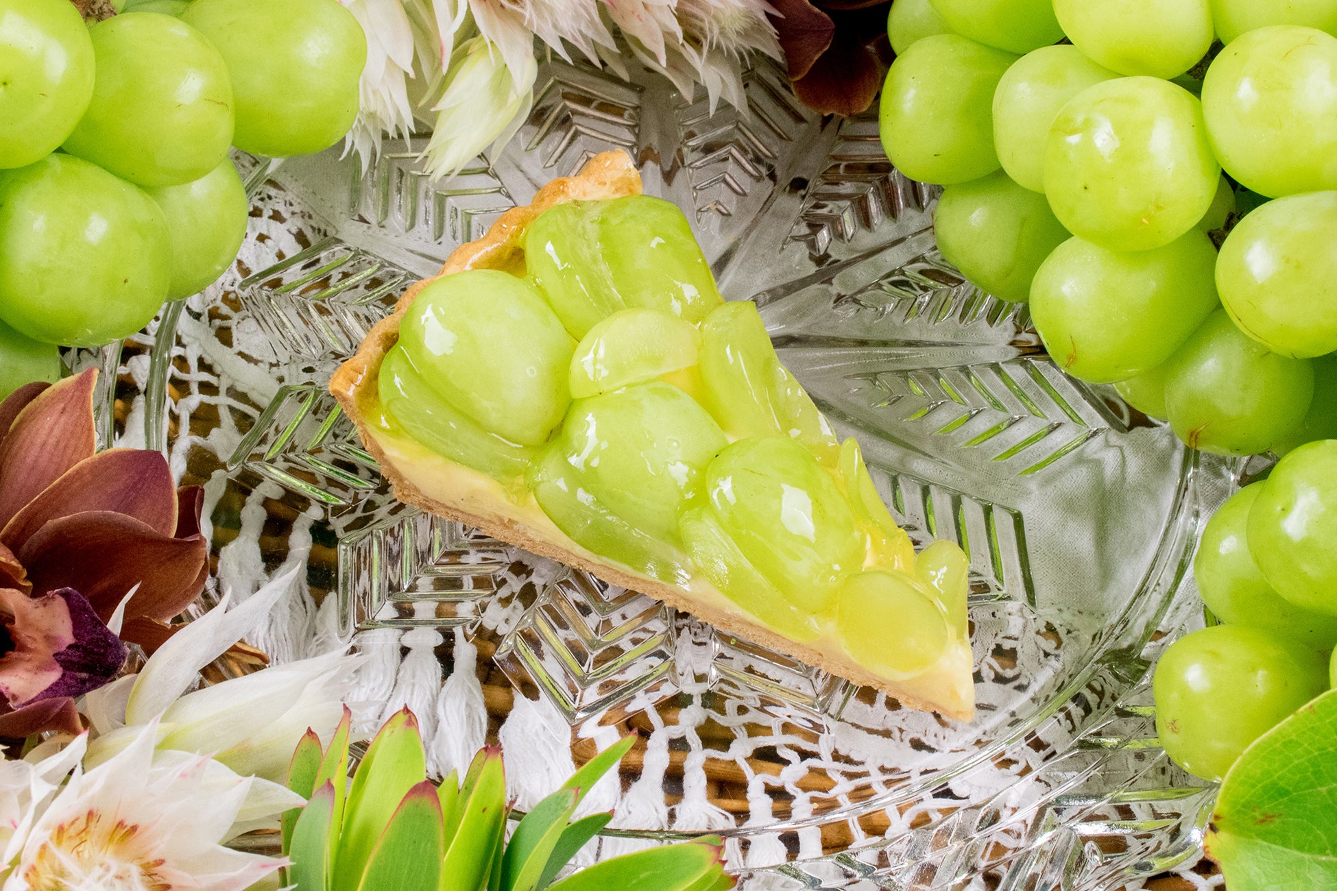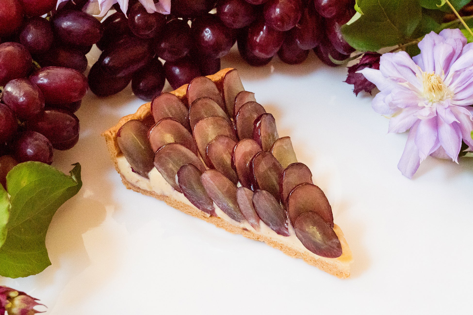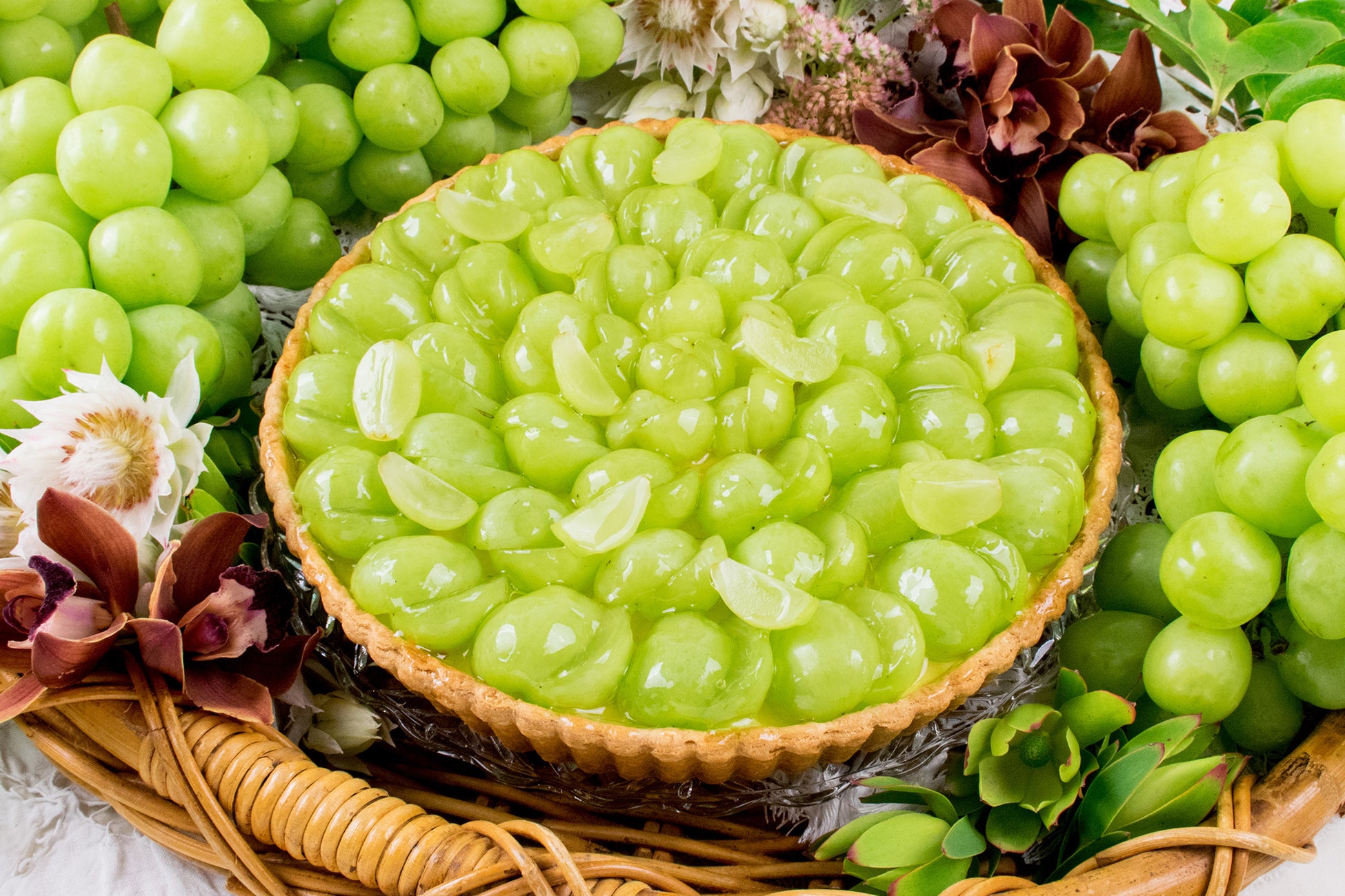 たっぷりの果汁、皮が薄く丸ごと食べることのできるカッタクルガンは、一房ずつ人工受粉が行われ、丁寧に栽培される葡萄です。やさしい甘さに仕上げたカスタードクリームにカッタクルガンをふんだんにのせたタルトです。