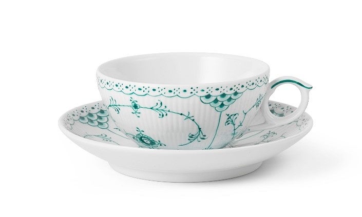 ロイヤル コペンハーゲンの最もクラシックなシェイプが、紺碧のエメラルドグリーン色のハーフレース モチーフで彩られています。あなたのコレクションに加えたい永遠のクラシックな作品です。