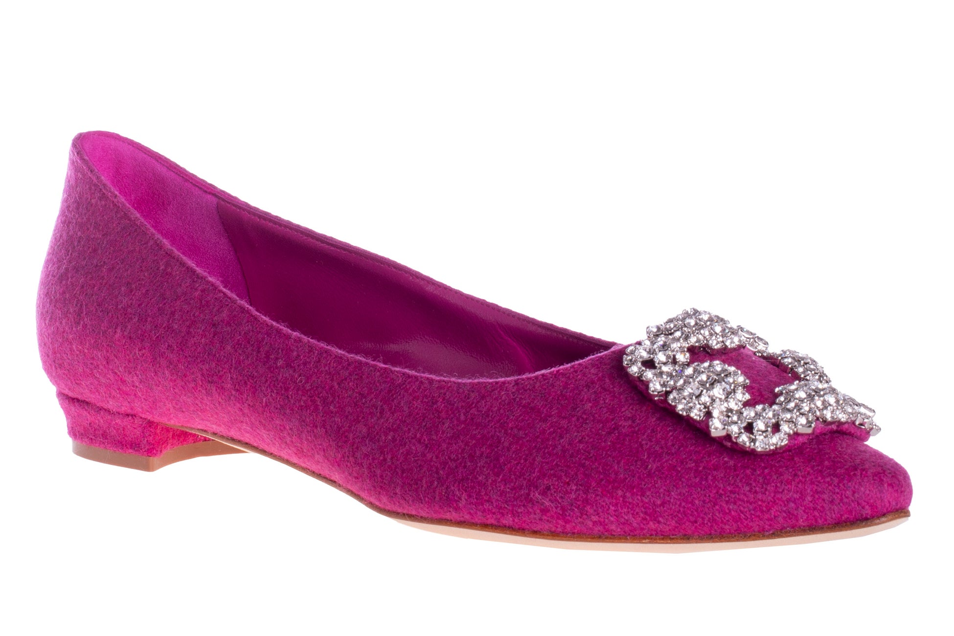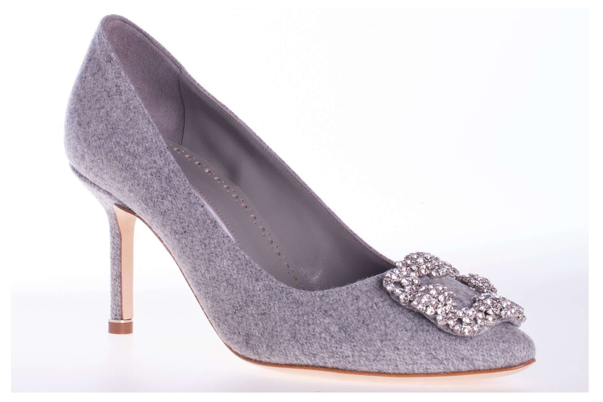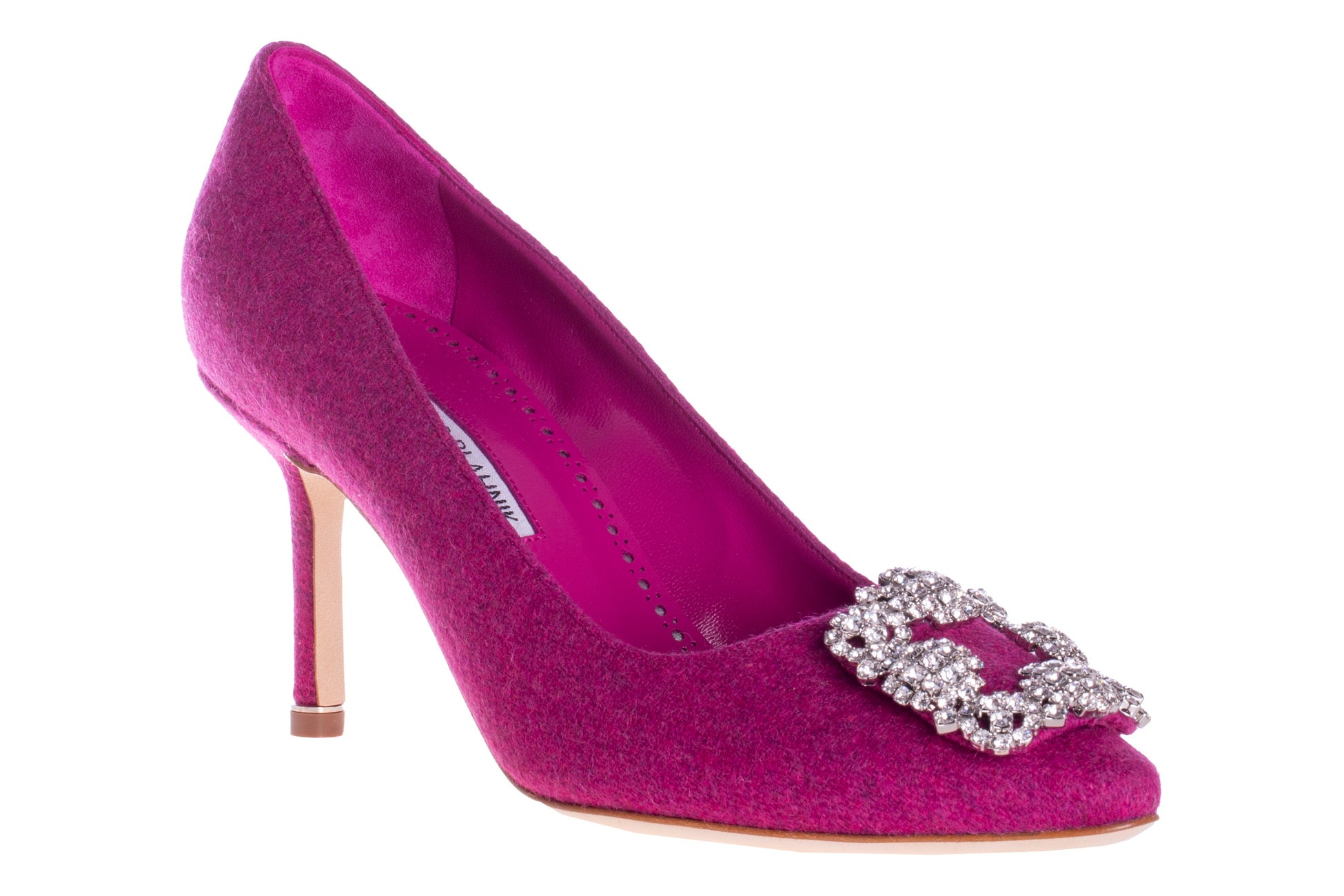 英国へのリスペクトからツイードをこよなく愛するマノロ・ブラニクは、今シーズンスコットランドのヘブライダンツイードでハンギシを更新しています。フューシャピンクとソフトなグレーにクリア・クリスタルのバックルが印象的な仕上がりです。