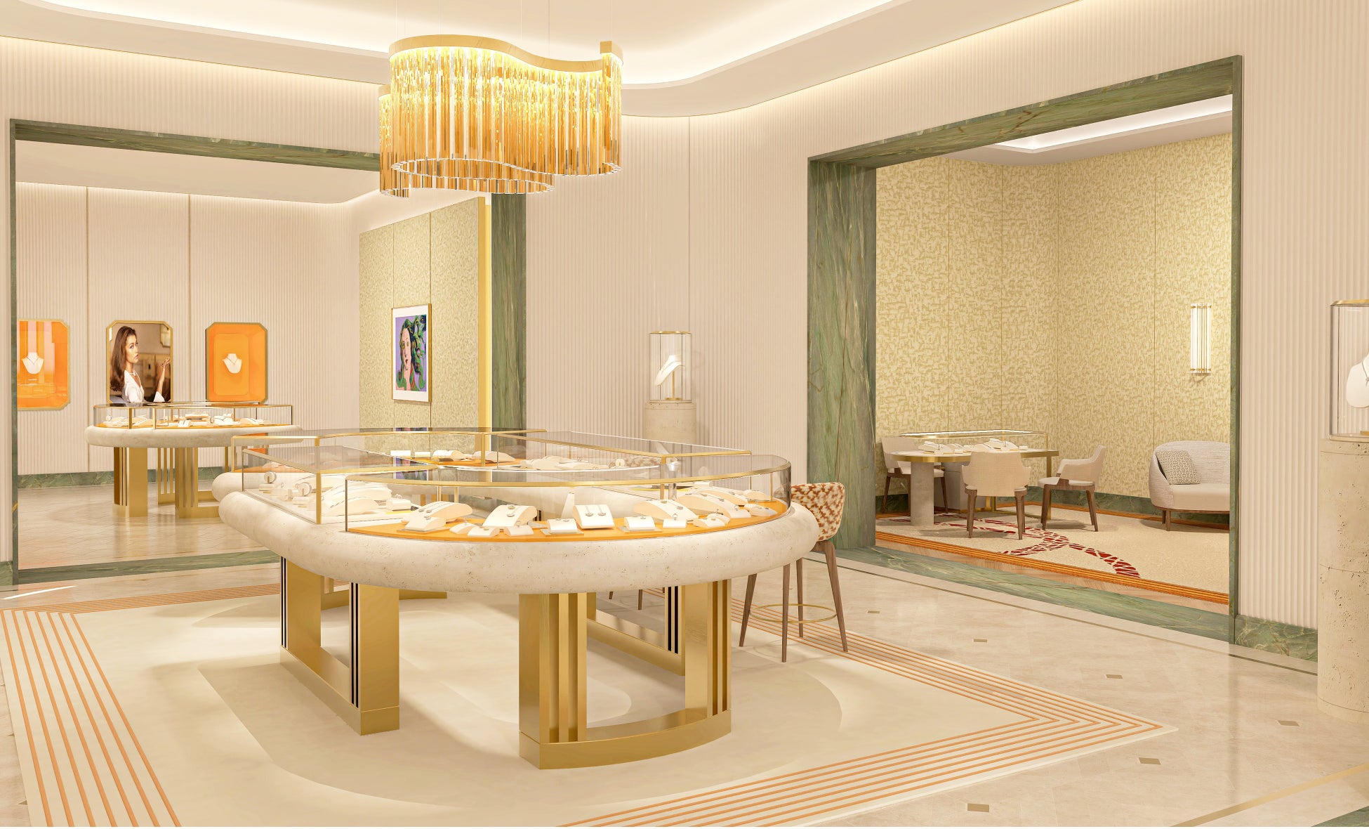 店内には、コンテンポラリーなイタリアンデザインのエレガンスとラウンジの快適さを併せ持つプライベートセールスルームが併設され、美しいファブリックや職人の漆喰の技術など細部にまでこだわりがみえます。ホスピタリティエリアには、ブルガリのアイコニックな「トゥボガス」からインスパイアされたデザインのバーカウンターも完備されています。イタリア語で「ガスパイプ」を意味するトゥボガスは貴金属の2本の柔軟なチューブ状のバンドをはんだ付けすることなく巧みにつなぐ古代の職人技が特徴となり、1940年代から今日に至るまで、メゾンの過去と未来の間を切り開く大胆で象徴的そして時代を超越したシグネチャーを表現してきました。