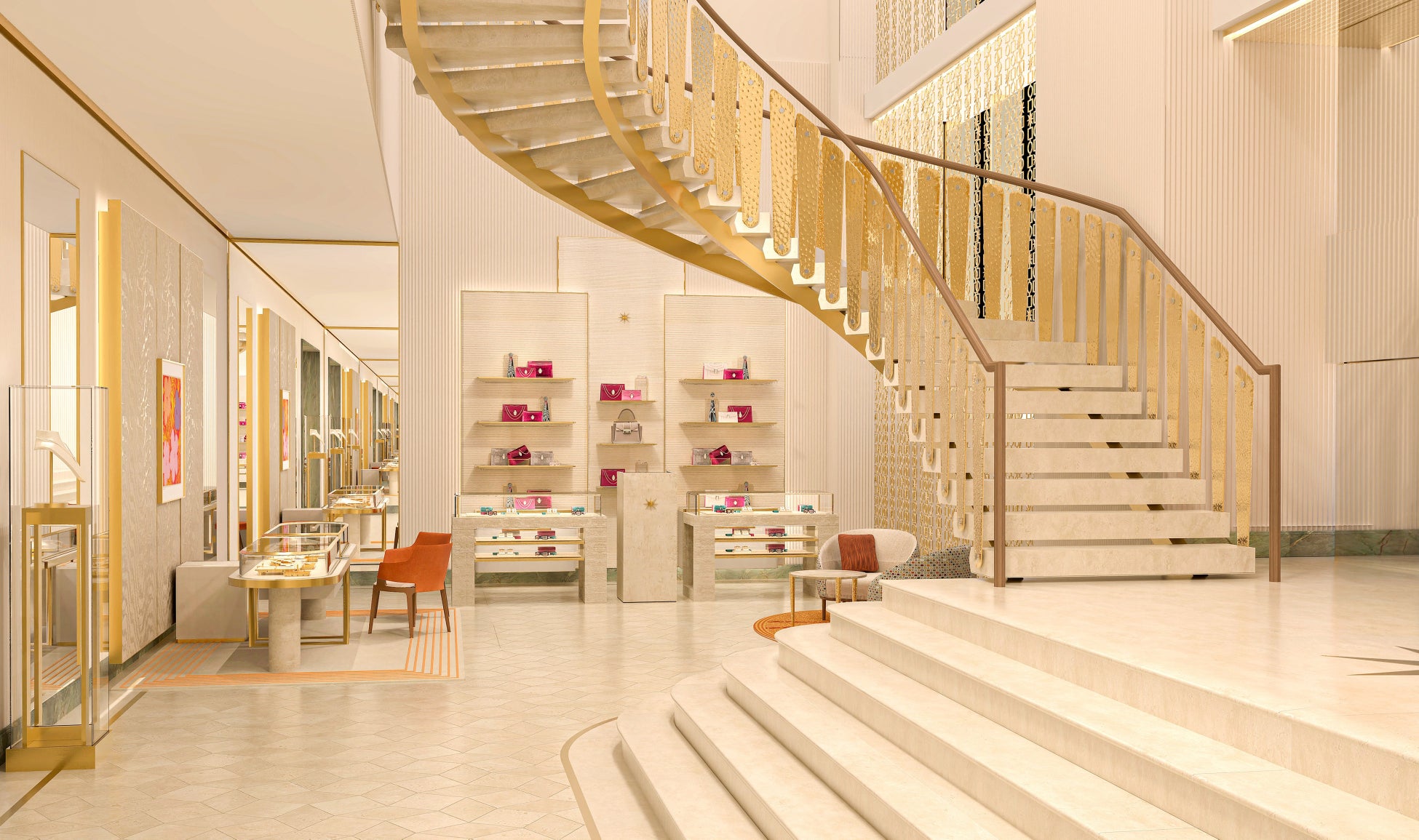 2フロアに渡る店内は、ダークグリーンのエメラルドカラーの大理石を使用したエレガントなポータルと大階段に縁取られた隣接する部屋で構成され、ローマ ブルガリ本店内のミュージアムスペース「ドムス」を彷彿とさせます。ローマが、訪れる人に思いがけない出逢いをもたらすマジカルな都市であるように、ブルガリを訪れることは驚きに満ちたブルガリのクリエーションとめぐり合うかけがえのないひとときとなるでしょう。