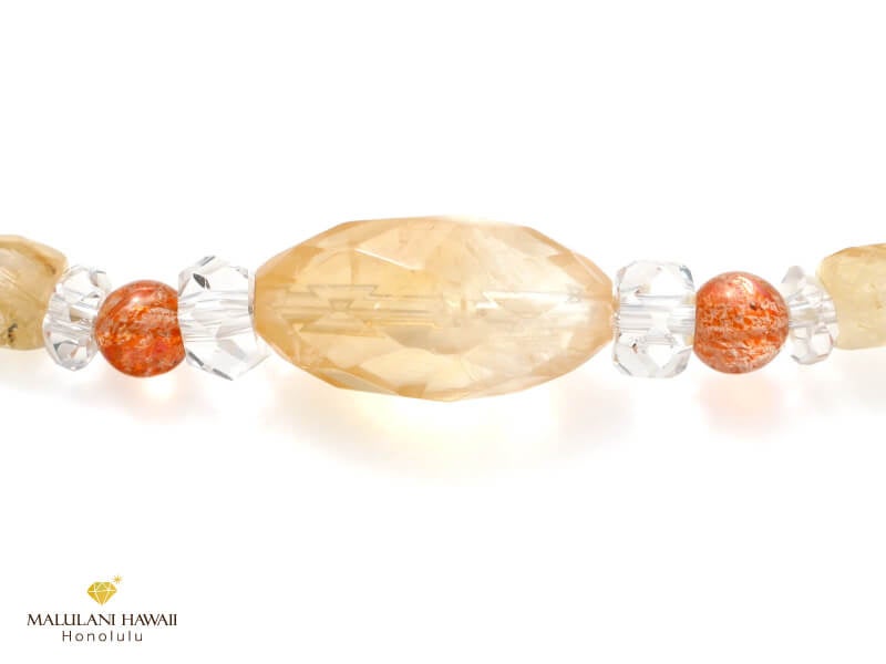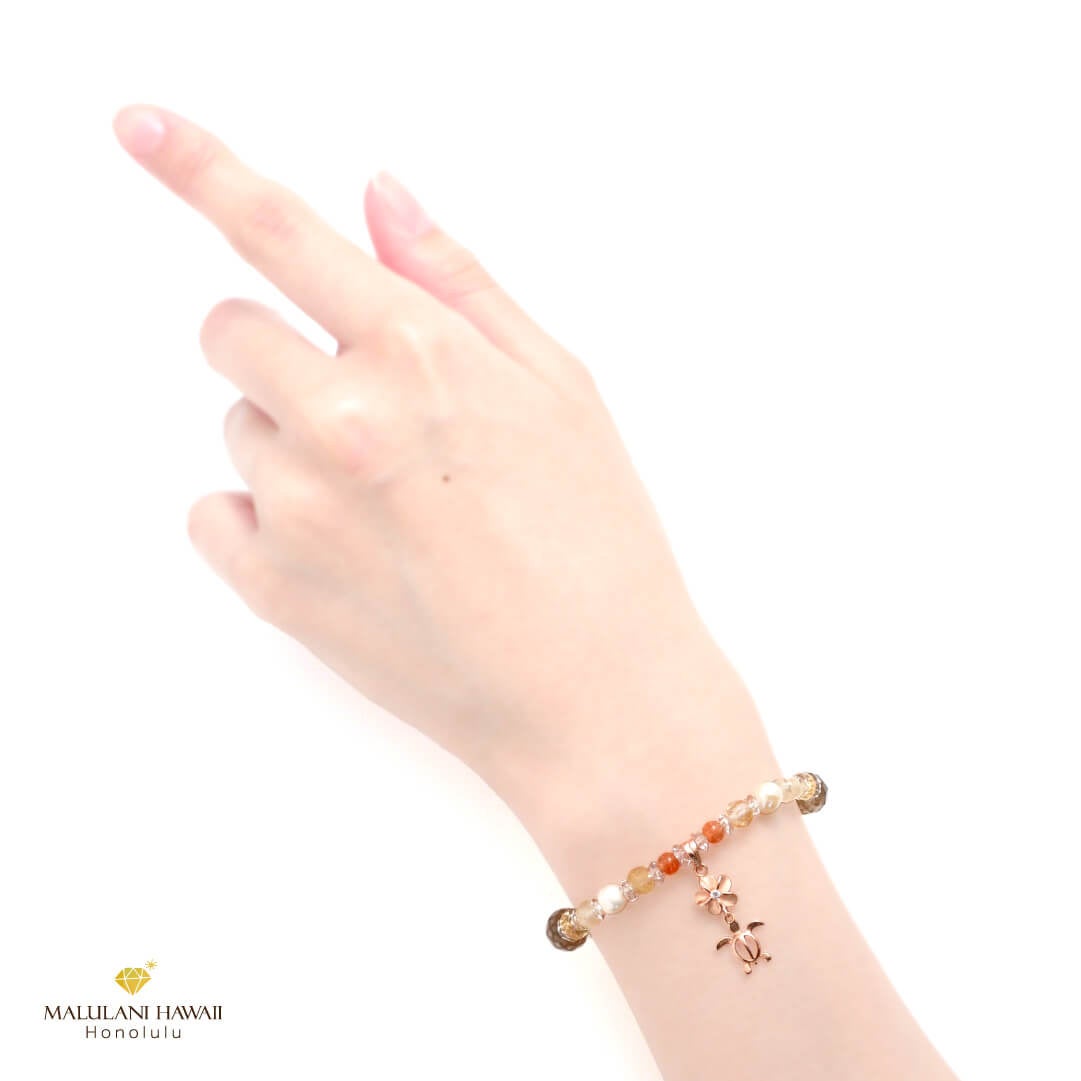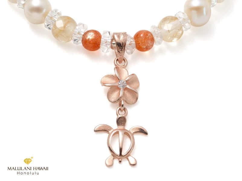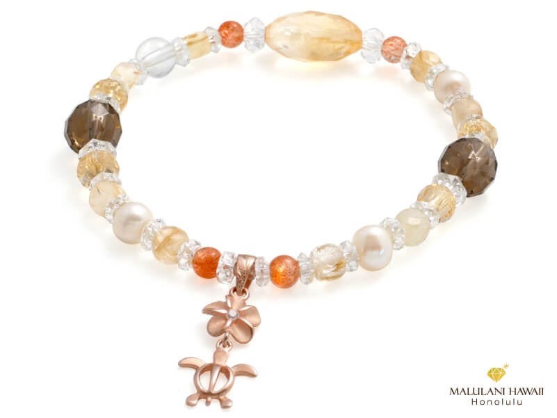 魅力を引き出すプルメリア、健康と幸運をもたらすホヌが連なるハワイアンジュエリーを添えたブレスレットは、太陽を象徴するシトリンやサンストーンに、必要を満たすゴールデンルチルなど、光り輝く明るい石を、エレガントなカットストーンでセレクト。