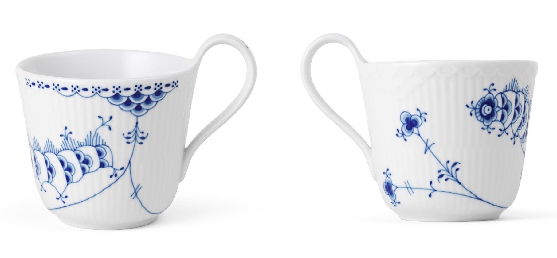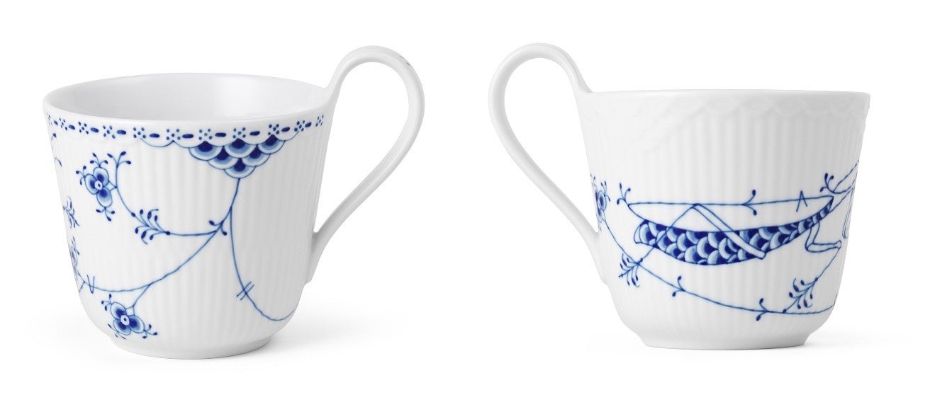 もうひとつのハイハンドルマグには、ロイヤル コペンハーゲンのクラシックなレース コレクションの手描きの絵柄を用いて、誇り高きカマキリに命が吹き込まれています。