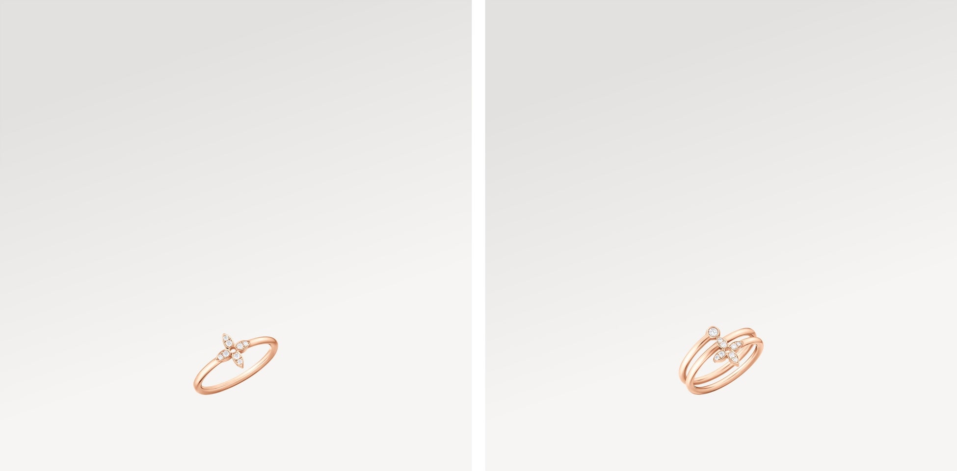 新作の最後を飾るのは、チャーミングで優美な2種のリング。シングルダイヤモンドとスターシェイプのモノグラム·フラワーが連なるエレガントな3連デザインのリングは、トレンディなスタッキング効果を生み出します。