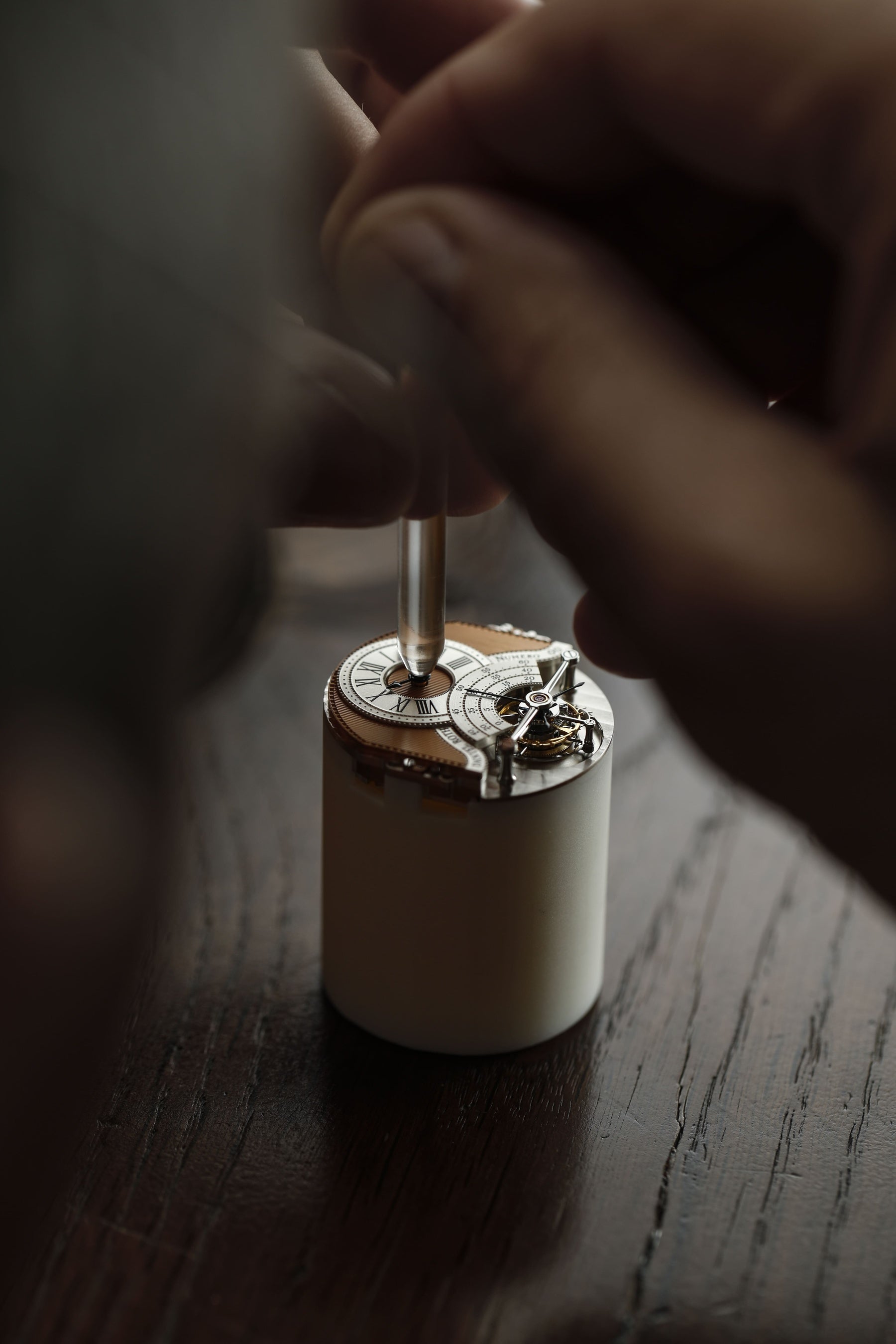 「トゥールビヨン スースクリプション」と同様、ダイアルはカリ·ヴティライネンの有名なギョーシェ彫りアトリエとのコラボレーションで製作。ギョーシェ加工は、手動で操作される直線エンジン旋盤を用いて手作業で行われ、垂直な線を1度に1本ずつ彫ります。1つ1つのダイアルは鋭い目と巧みな手を必要とする労作であり、ほんのわずかなミスがあるだけでダイアルを廃棄しなければなりません。