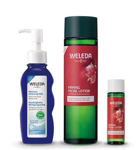 うるおいを守りながら汚れをきちんとオフするモイスチャー クレンジングミルクと、新製品「ざくろ ファーミングローションEX」のベーシックケアセット。同ローションのトラベルサイズ(20mL)が付き、肌にたっぷりとうるおいを届けます。ヴェレダのフェイスケアを初めてお使いの方にもおすすめです。
