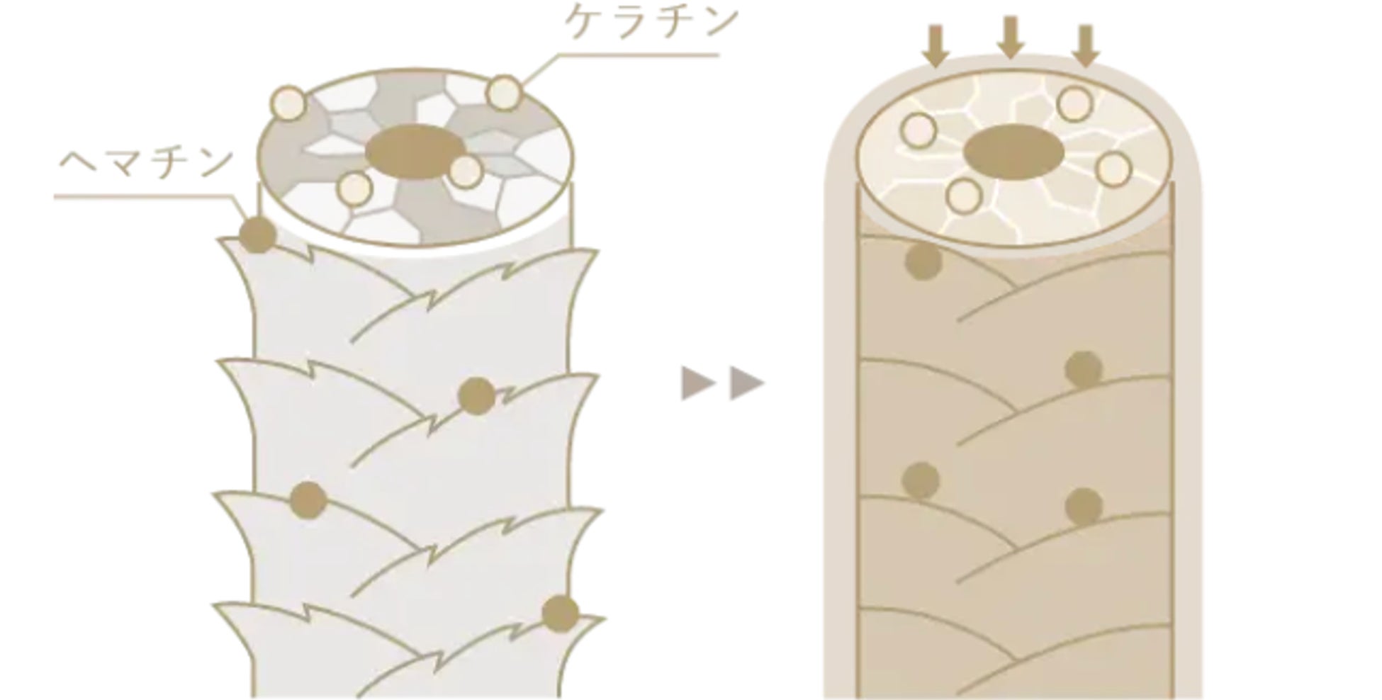 ヘアサロンなど、美容のプロの現場で使われているヘマチンを原液で配合しました。集中補修成分のヘマチン原液と髪の主成分のケラチンが髪内部とキューティクルまで浸透※し、髪の内側と外側をダメージ補修します。補修することで傷んで扱いづらかった髪を、ハリとコシのあるすこやかな“艶髪”へと導きます。
