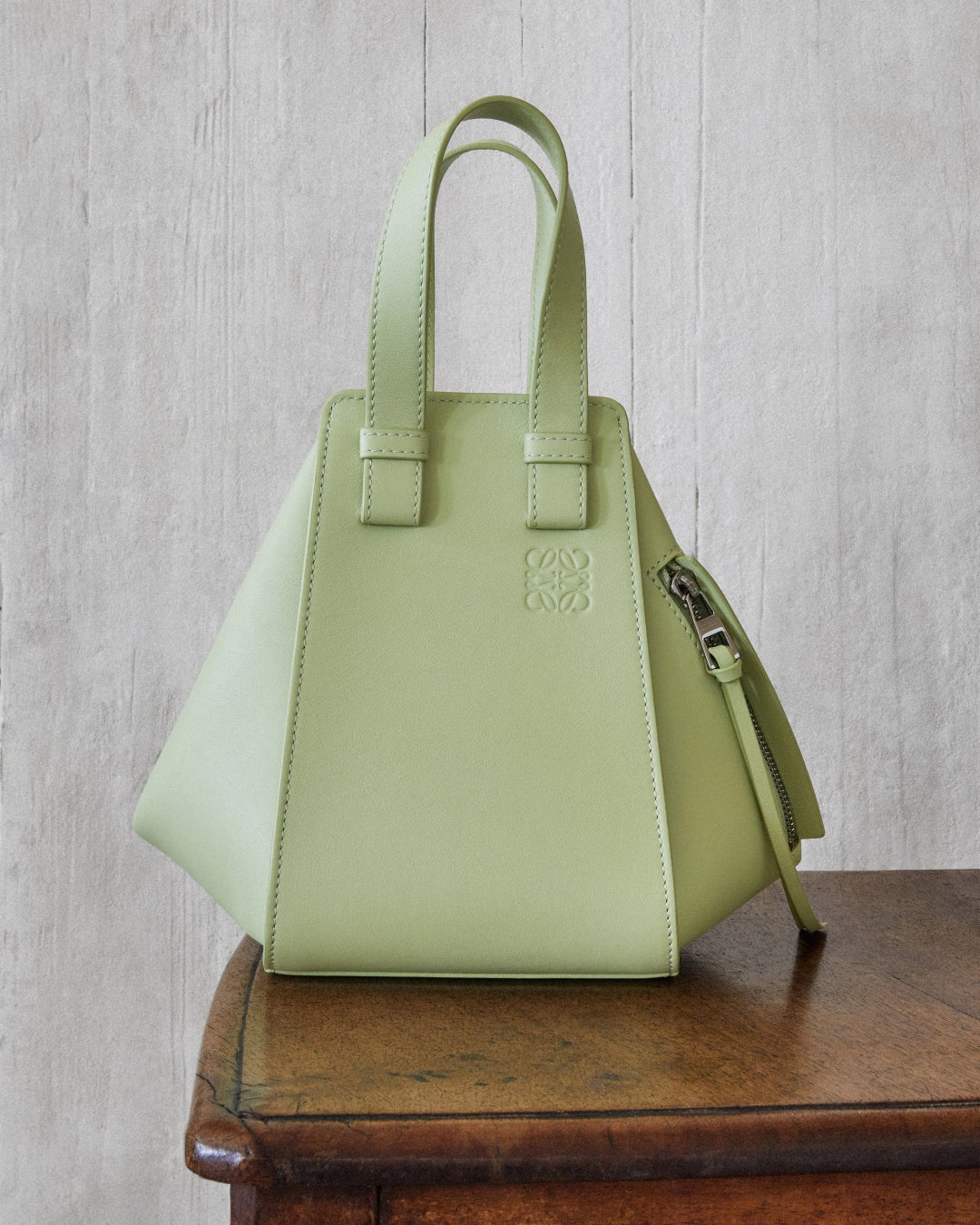 さまざまなサイズを展開しながら、ラフィアやウーブンレザー、キャンバスなどクラフトマンシップあふれる素材で再解釈されてきたハンモック。2024秋冬コレクションでは新色のライトペアーが登場。コレクションのボタニカルモチーフと淡く呼応します。