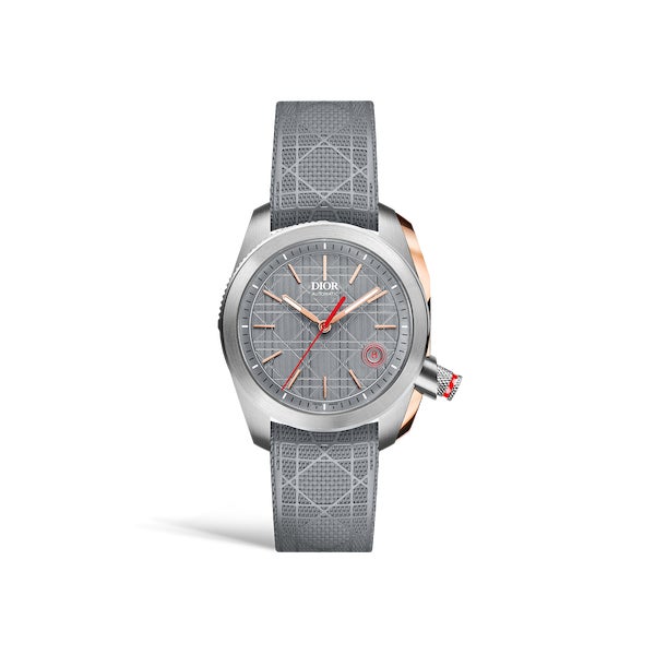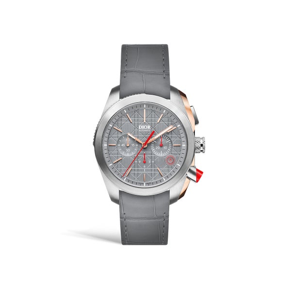 2024年10月、同コレクションに数量限定の2モデルが加わります。クチュールの美学を宿し、デザインに再解釈された新モデルでは、ダイアルや針など至るところにピンクゴールドがあしらわれ、マスキュリンとフェミニンのコントラストが際立つ、洗練性に溢れたデザインで登場します。全体にはディオールのヘリテージであり、シグネチャーでもあるグレーを纏い、「シフル ルージュ」のシンボルであるレッドをポイントに添えます。38mmの自動巻きモデルにはグレーのマクロカナージュラバーストラップを、41mmの自動巻きクロノグラフモデルにはグレーのアリゲーターストラップを配し、いずれもインターチェンジャブル仕様にて自由に付け替えをお楽しみいただけます。