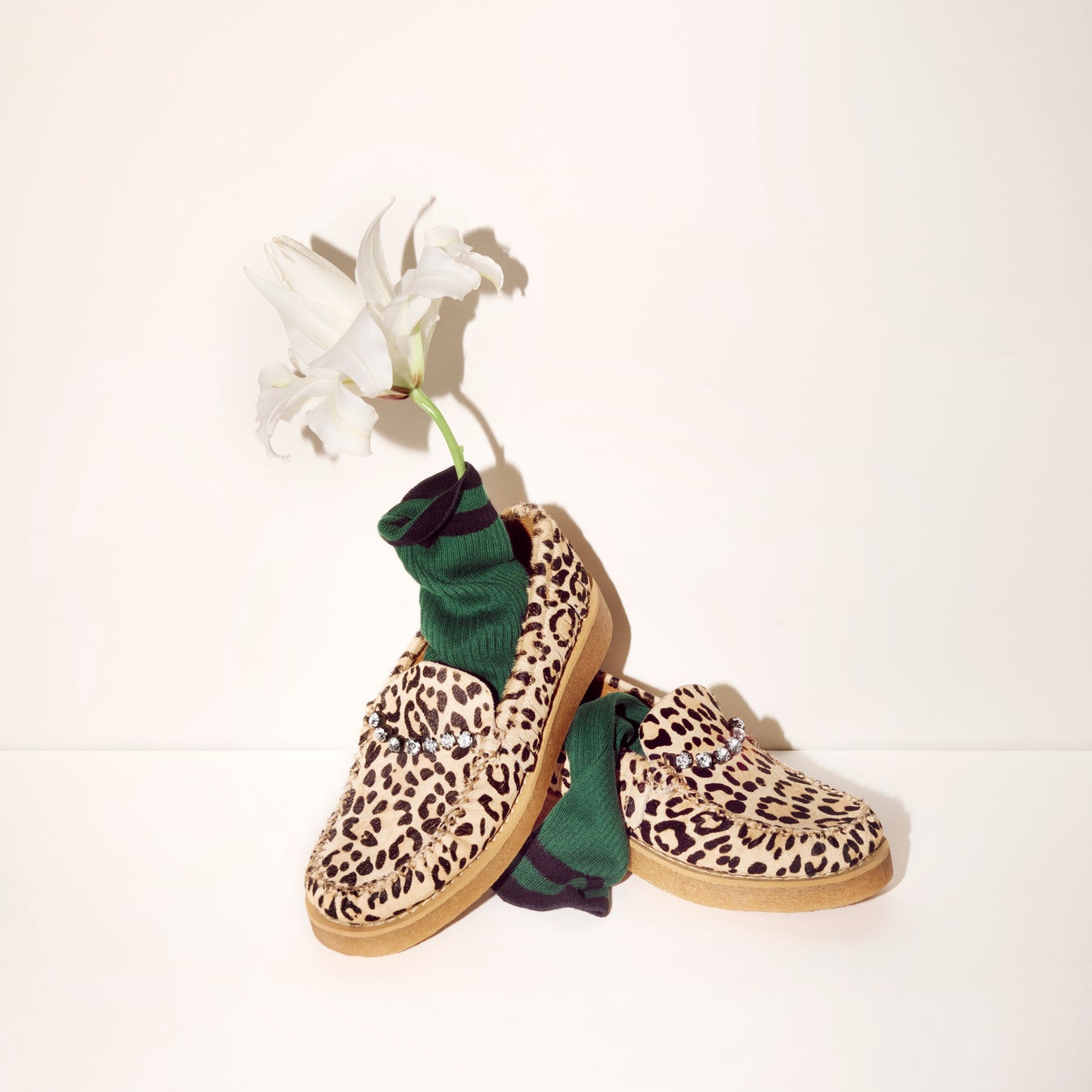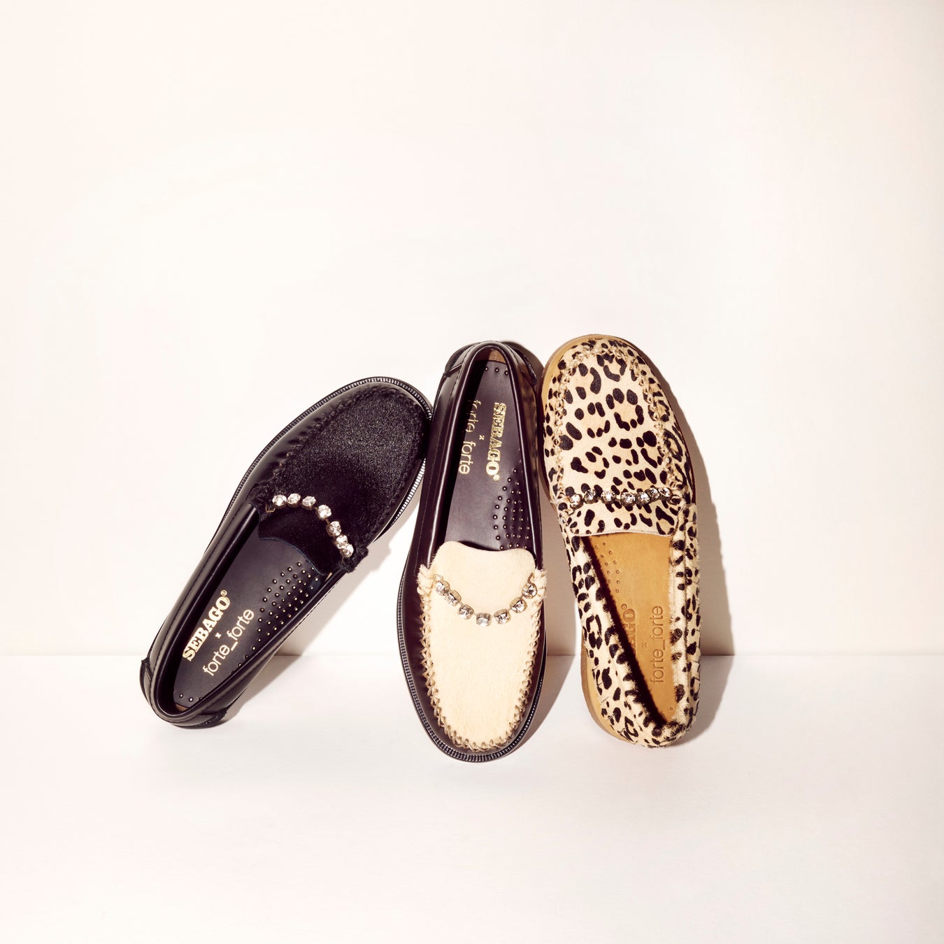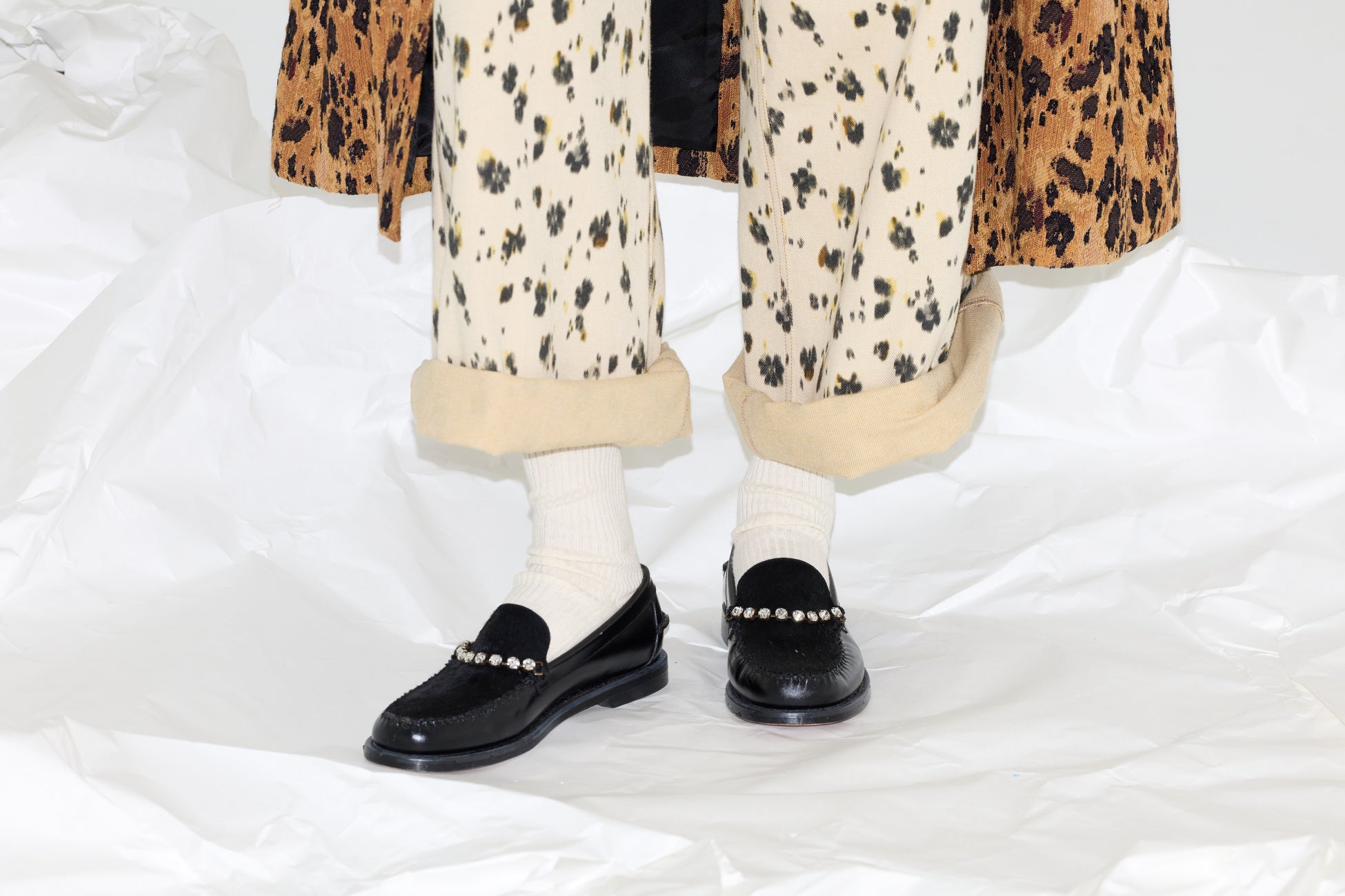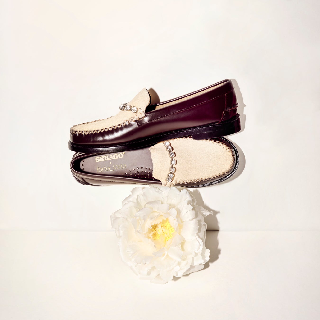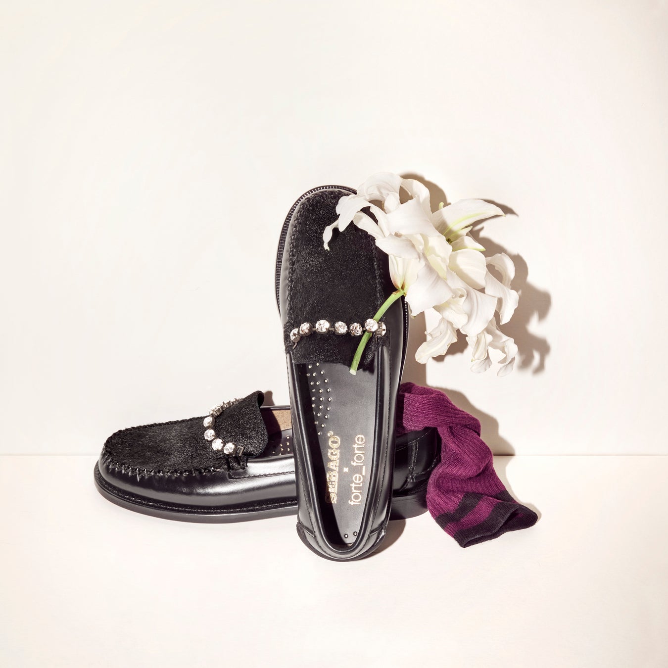 手刺繍のステッチで代表的な靴のサドルを強調することで、職人技の価値がそれぞれのモデルで際立っています。フォルテ フォルテのアイコンであるラインストーン・チェーンが、新しい「forte_forte loves sebago®」ローファーに華やかさを添えています。