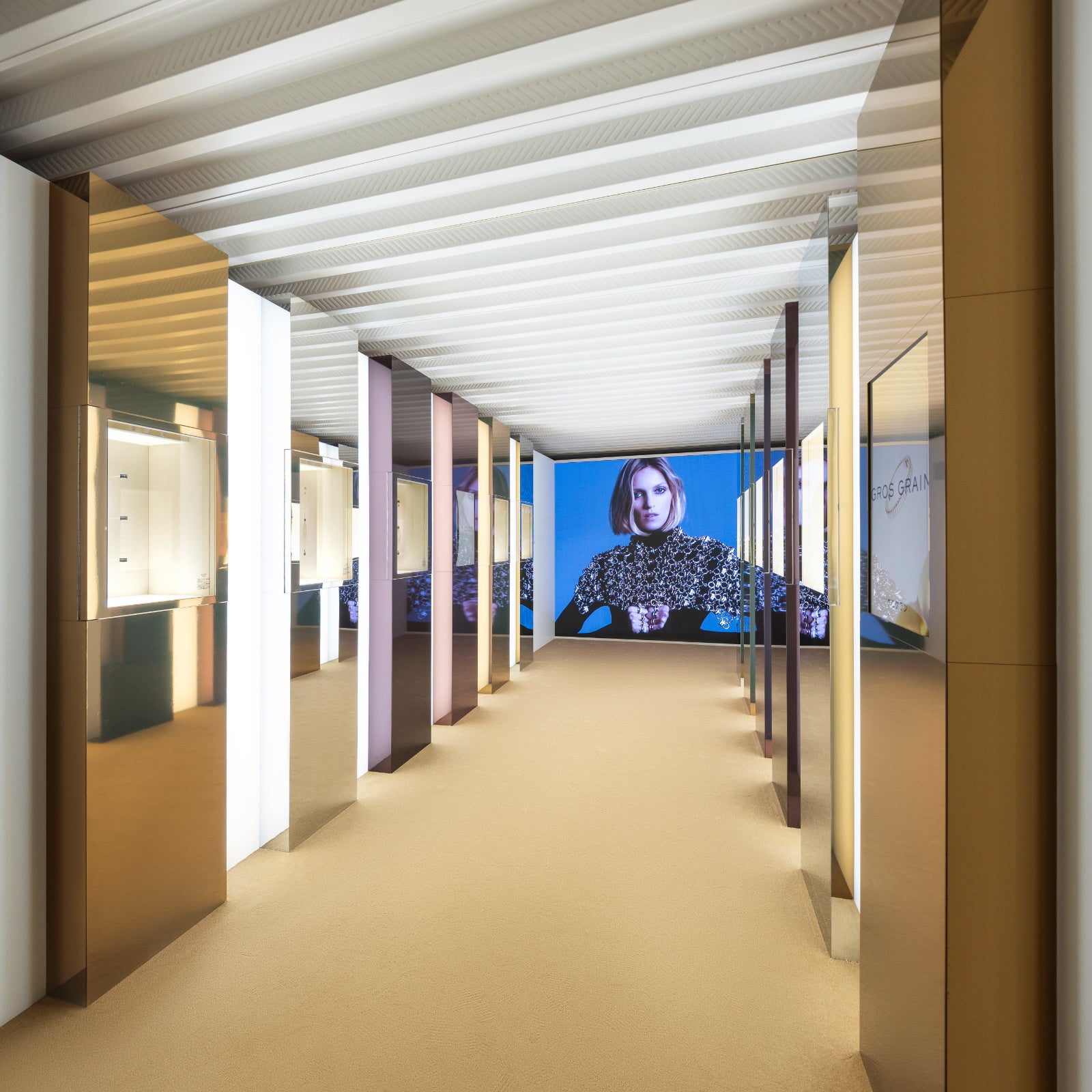 フランス語で「4」を意味する「キャトル」は、メゾンに継承される4つのデザインコードを組み合わせた、革新的でモダンなコレクション。「キャトル」を構成する4つのコードはそれぞれに意味を持ち、メゾンの歴史にオマージュを捧げています。グログラン、ダイヤモンド ライン、クル ド パリ、ダブルゴドロンの4つのコードが万華鏡のように変化する没入体験コーナーです。