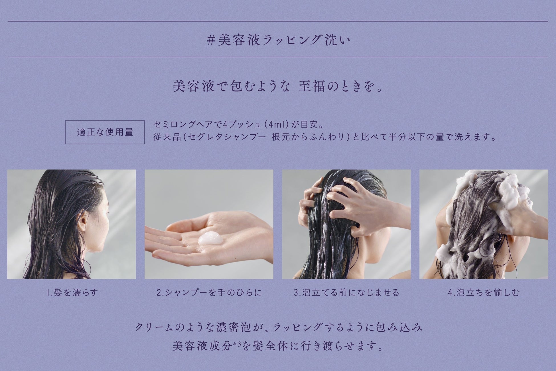 『セグレタ プレミア 凝縮美容液シャンプー』は、シャンプー内のラメラ層に成分を蓄える“ビューティストック技術”を採用し、セグレタシャンプー史上かつてない多量の美容液成分*³ を配合しました。美容液のようなテクスチャーのシャンプーを髪に塗り広げ、髪全体を包み込む“美容液ラッピング洗い”をすることで、高密度なクリーム泡へ変化。髪1本1本に美容液成分*³ を惜しみなく届けながら洗い上げ、至福のときを提供します。