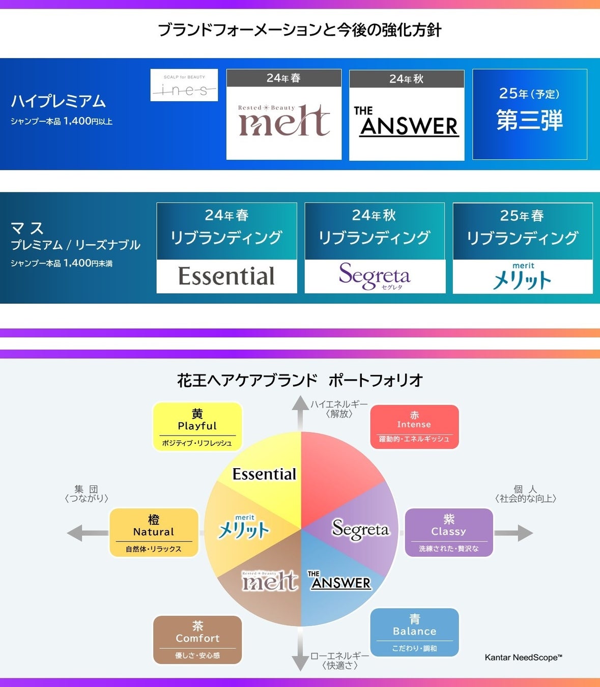 今回の事業変革では、拡大する「ハイプレミアム」市場*² への参入を本格化し、第一弾として「melt(メルト)」、第二弾として「THE ANSWER(ジアンサー)」を発売。併せて、「マス(プレミアムマス/リーズナブルマス)」市場*² における既存ブランド「merit(メリット)」「Essential(エッセンシャル)」「Segreta」をリブランディングし、ブランド力を高めていきます。これらの変革を通じて、花王は、ヘアケア事業を成長ドライバー事業へと育成強化してまいります。