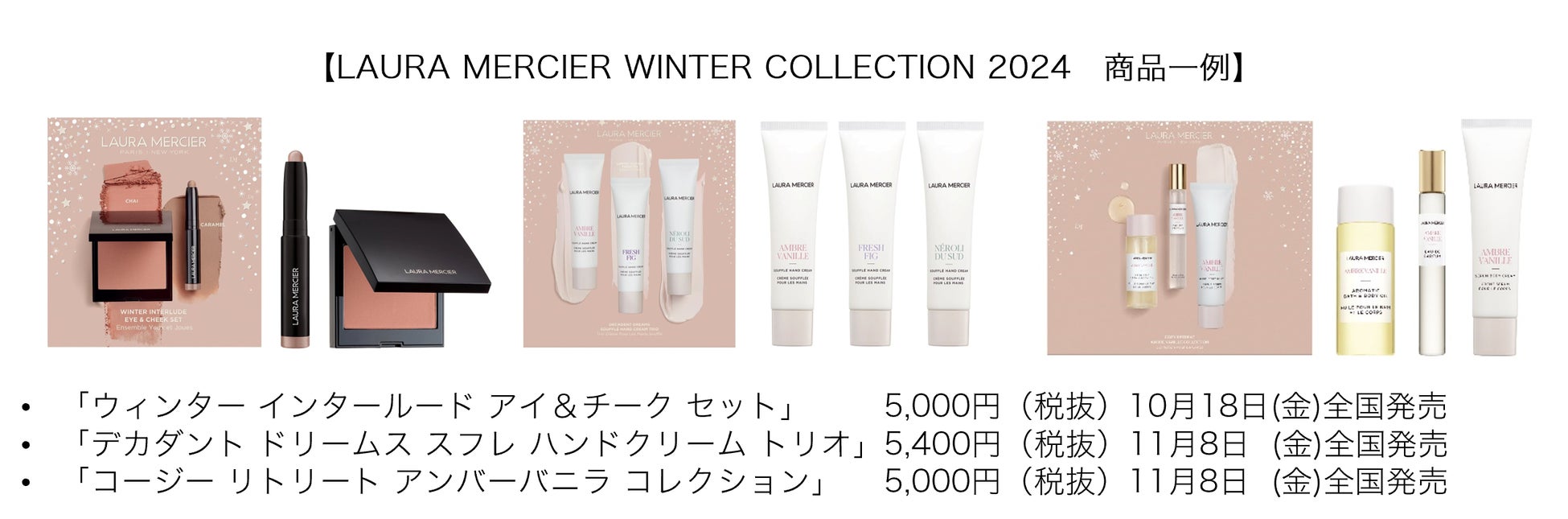 2024年、ローラ メルシエのウィンターコレクションのテーマは“Atelier Enchanté (アトリエ アンシャンテ)”。雪が降るといつもの馴染みある街並みも全く新しい景色になり、まるではじめまして(Enchanté / アンシャンテ)の印象に。秋冬限定で開催するサーカス場として知られるパリのシルク・ディヴェールの歴史ある正二十角の建物は雪をかぶり、ニューヨークシティのストリートは粉雪でキラキラと輝きを放つ。降雪がつくりだす魔法がかった美しき景色は、まさにフローレス・ファンタジー。