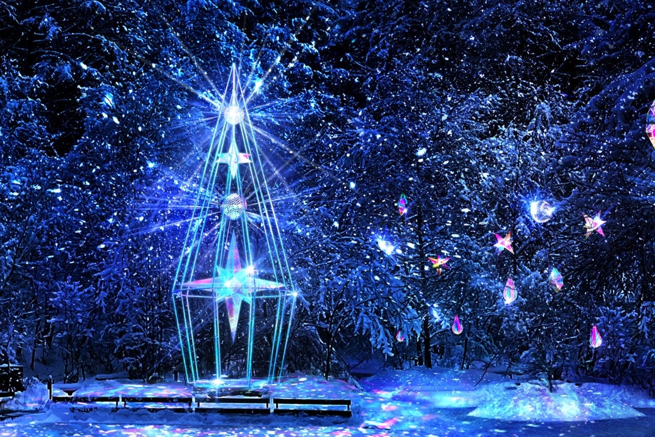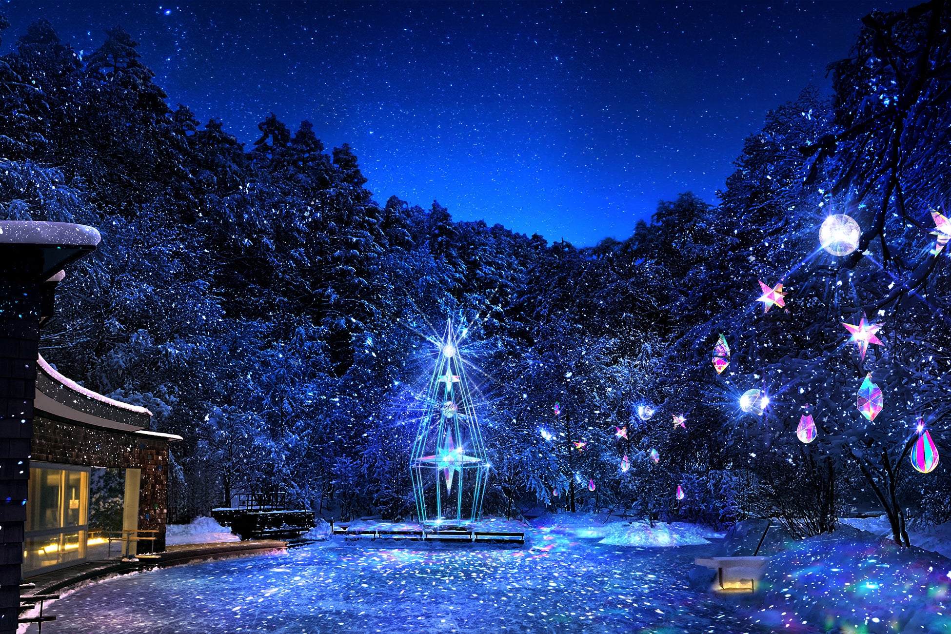 ケラ池スケートリンクの空間全体に光の装飾を施し、豊かな自然と光が織りなすインスタレーションを作り上げます。テーマは「森の神秘」。森の中にある池には小さな島が点在しており、木々に星やつぼみ、宝石のオブジェを飾ります。つぼみは水のしずくの形状を、宝石は氷の結晶を象り、水が結晶化して氷になる様子を表現しています。木立の中でミラーボールから放たれた光が反射し、無数の美しい星屑のように煌めきます。
