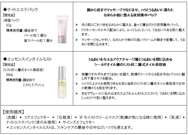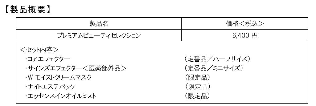 そこで、「活性型チオレドキシン※3」に着目したエイジングケア※2美容液「コアエフェクター」をはじめ、顔から首まで集中ケアする夜用集中パック、メイクの上からも使えるミスト状二層式オイル美容液、濃厚な高保湿マスクなどをセットし、寒気や乾燥にも負けないツヤと弾力に満ちた肌に導く贅沢なキットを開発しました。