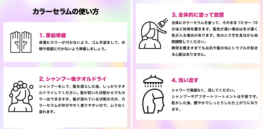 ④しっかり染料がなくなるまで洗い流してください。カラーセラム後トリートメントの必要はありません。