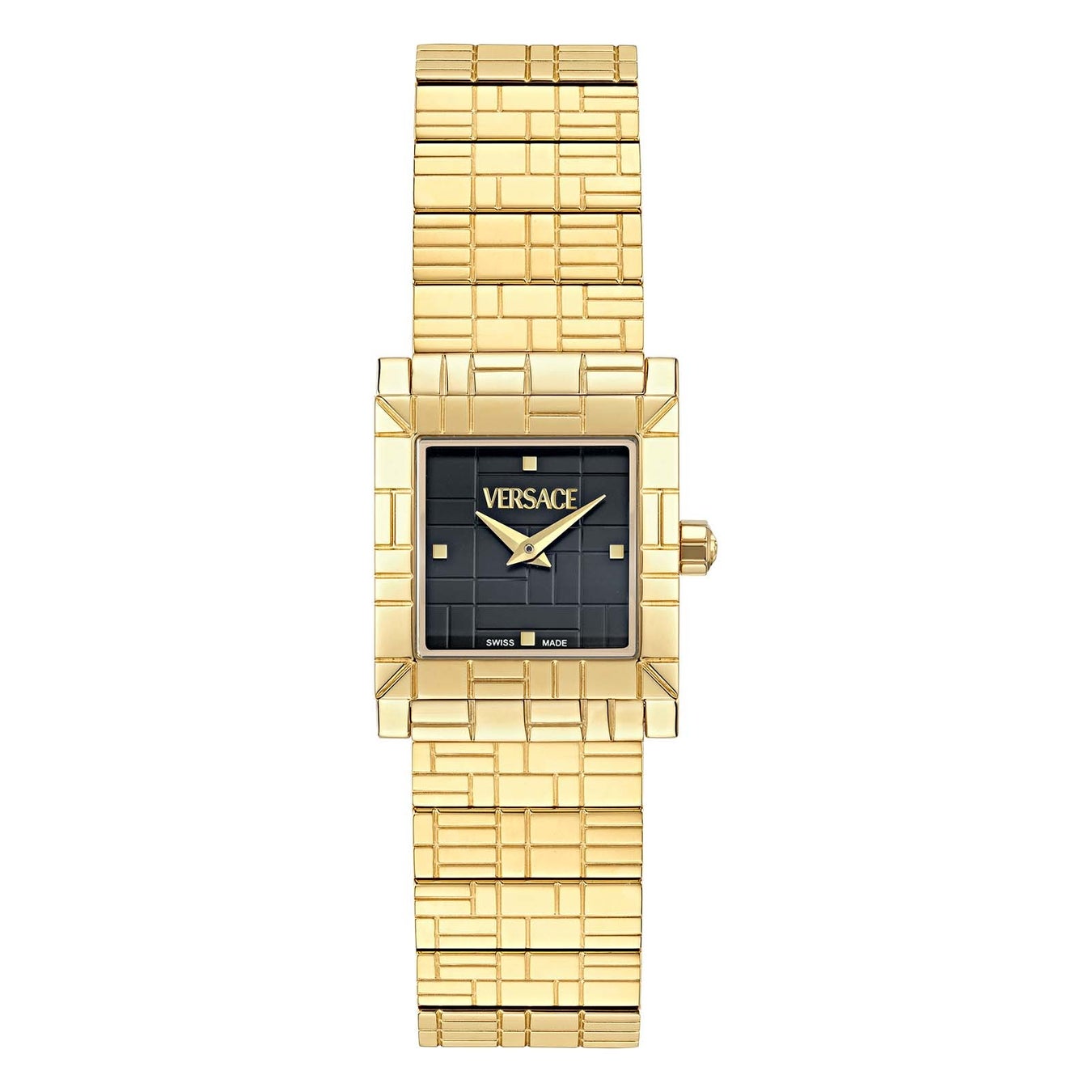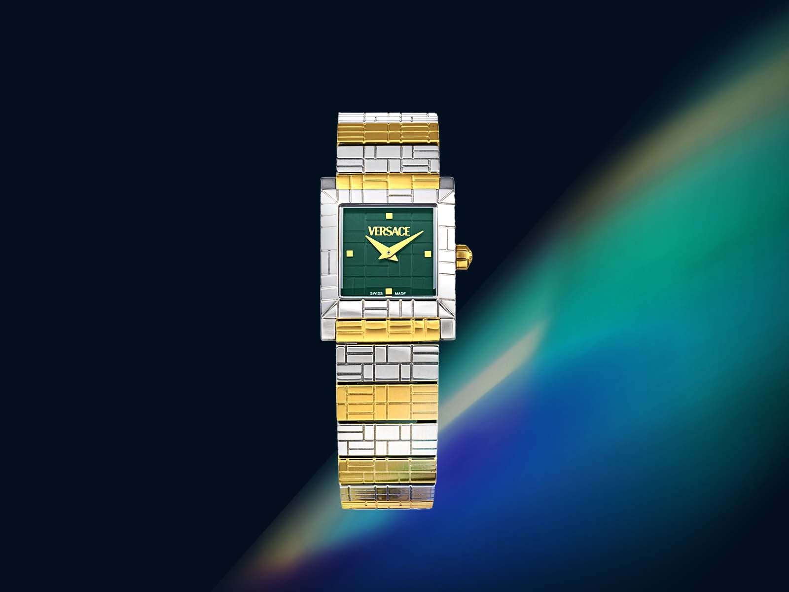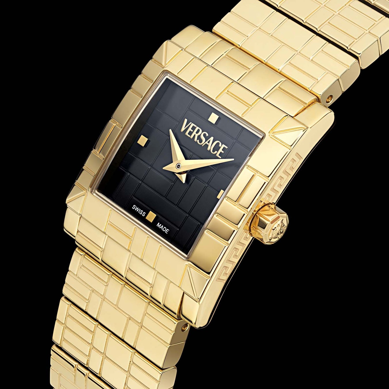 幾何学的なモザイクデザインを取り入れたスクエアケースとベルトに加え、ケースサイドに飾られたラ・グレカやメドゥーサ入りのリューズなどの美しいモチーフが繊細に刻まれています。インデックスにも四角いモザイクタイルが使われ、12時位置にはVersaceロゴがあしらわれています。今まで見たことのないエレガントな装いを誇る新作ウォッチです。