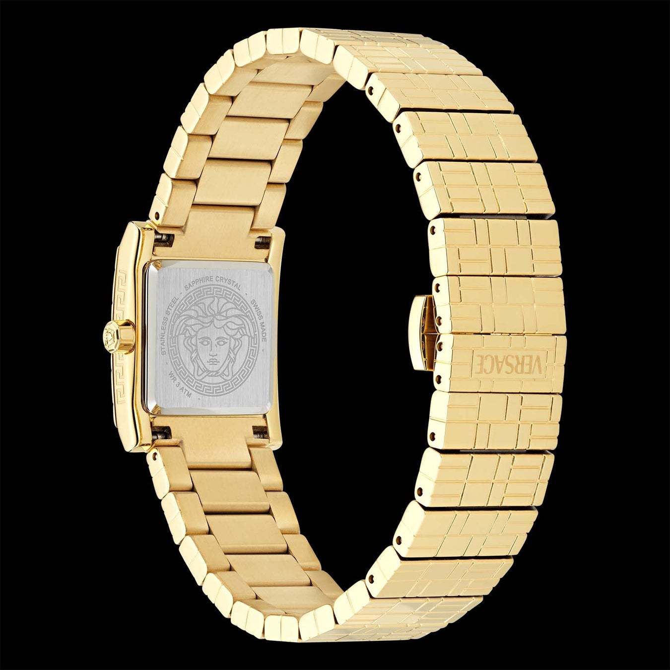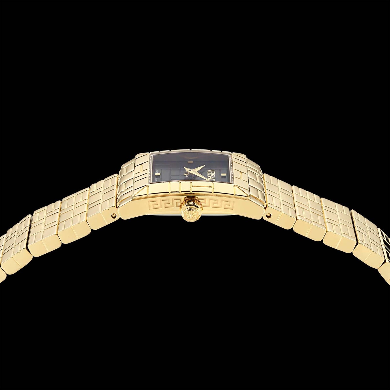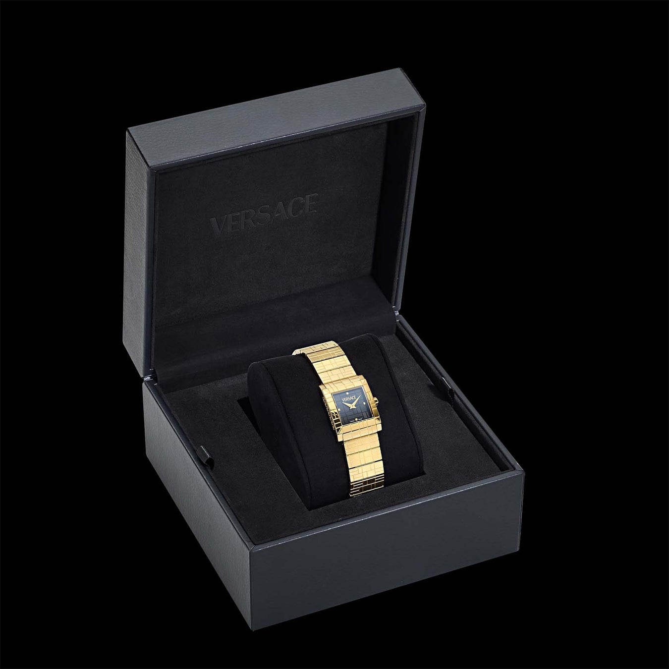 幾何学的なモザイクデザインを取り入れたスクエアケースとベルトに加え、ケースサイドに飾られたラ・グレカやメドゥーサ入りのリューズなどの美しいモチーフが繊細に刻まれています。インデックスにも四角いモザイクタイルが使われ、12時位置にはVersaceロゴがあしらわれています。今まで見たことのないエレガントな装いを誇る新作ウォッチです。
