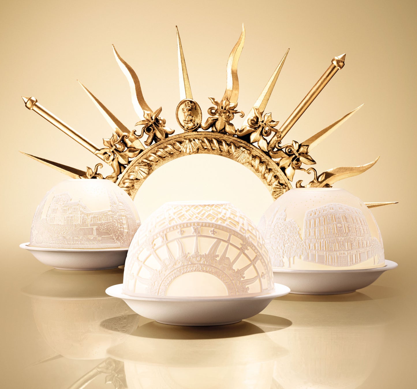 3つの異なるデザインのうち、1つ目は、ピエトロ・ルッフォがディオール ホリデー2024のために描いたパターンの中から、ヴェルサイユ宮殿の門にデザインされた太陽王のモチーフ、時計の文字盤、さらには庭園の大理石の床模様に着想を得た背景がデザインされています。そして2つ目は、パリのディオール本店「30モンテーニュ」が描かれ、3つ目にはクリスチャン・ディオールが愛した自邸「ラ コル ノワール城」がデザインされています。リトファニーとセットで届けられる専用のキャンドルは、フランシス・クルジャンが特別に創作した温もりのあるウッディ ノートが広がる「ボア デ レーヴ」の香り。キャンドルに火が灯されると、リトファニーの繊細な彫刻が美しく浮かび上がり、幻想的に揺らめく光を演出します。