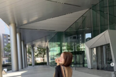 ブラックコーデとの対比でネイルがより引き立つスタイルとなっており、写真ではすらりとした脚や引き締まったスタイルが注目を集めています。